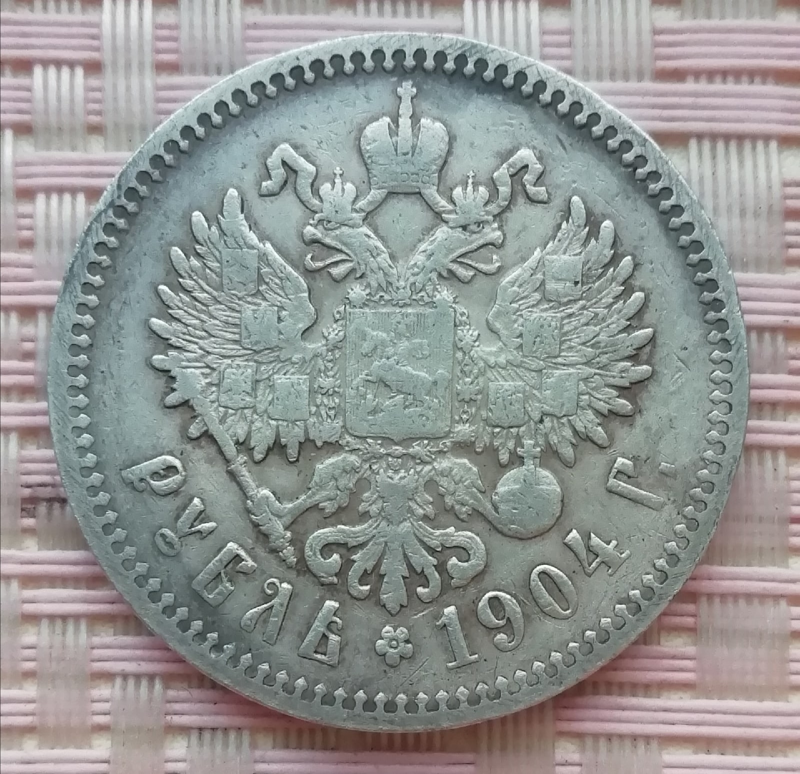 Монета номиналом 1 рубль 1904 года, отчеканенная в серебре в период правления Николая II. В сообществе нумизматов монета признана подделкой. Основные претензии — несоответствие деталей аверса и реверса, «скачущие» буквы и отсутствие чётких признаков подлинного чекана.
