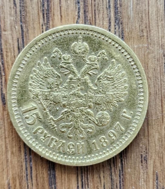 Монета номиналом 15 рублей 1897 года, отчеканенная в золоте при императоре Николае II в рамках денежной реформы Витте. Несмотря на внешнее сходство, представленный экземпляр является подделкой. В комментариях эксперты указали на низкое качество исполнения и признаки литья, характерные для фейков.