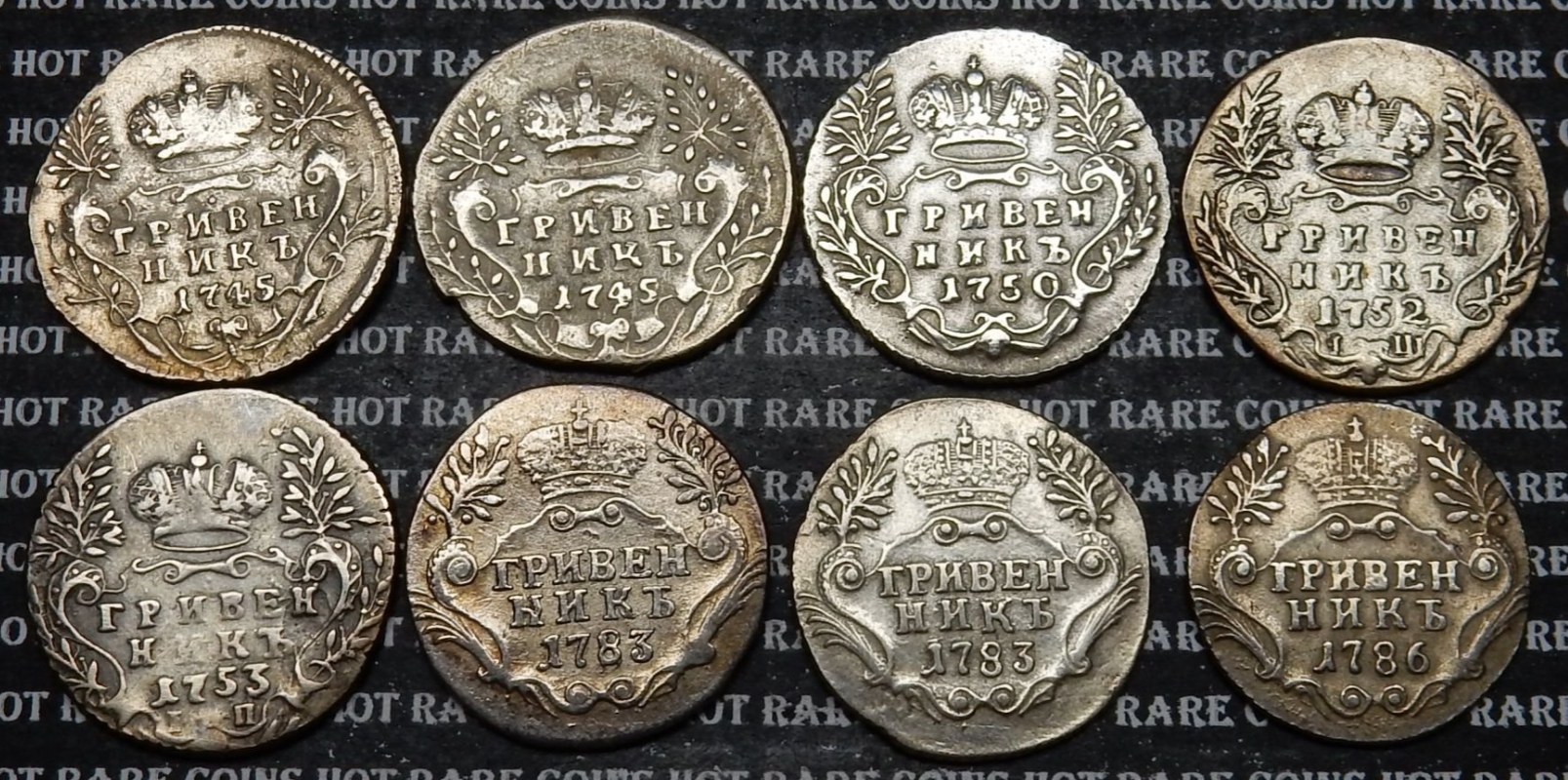Представлены копии серебряных монет номиналом 10 копеек (гривенников) периода правления императриц Елизаветы Петровны и Екатерины II. Это современные реплики, не имеющие нумизматической ценности, созданные для коллекционеров сувениров или для учебных целей. Владелец лота прямо указал на их неоригинальность в описании.