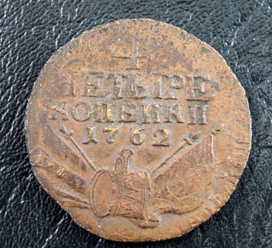 Монета номиналом 4 копейки 1762 года, отчеканенная в правление императрицы Елизаветы Петровны. Данный экземпляр является современной подделкой, изготовленной методом литья. Подлинные медные монеты этого периода имеют характерные особенности чеканки и гурта, которые отсутствуют у данной копии.
