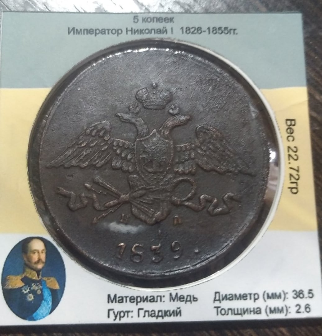 Медная монета 5 копеек 1839 года, отчеканенная на Екатеринбургском монетном дворе (инициалы «ЕМ»). Относится к периоду правления императора Николая I. Монета является подлинной, о чём свидетельствует консенсус в комментариях экспертов, несмотря на её среднюю сохранность и возможную постороннюю патину.
