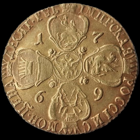 Монета представляет собой копию золотого империала 1769 года, отчеканенного в правление Екатерины II. Несмотря на качественную чеканку, она является новоделом или сувенирной репликой, о чём прямо указано в посте. Искусственная патина и отсутствие естественных следов обращения подтверждают её неоригинальное происхождение.