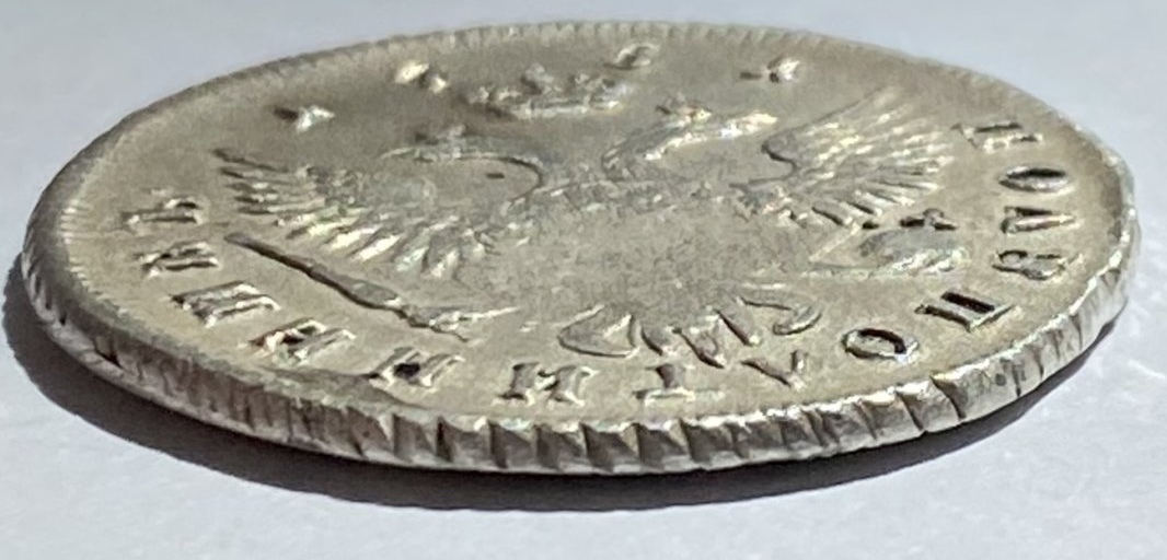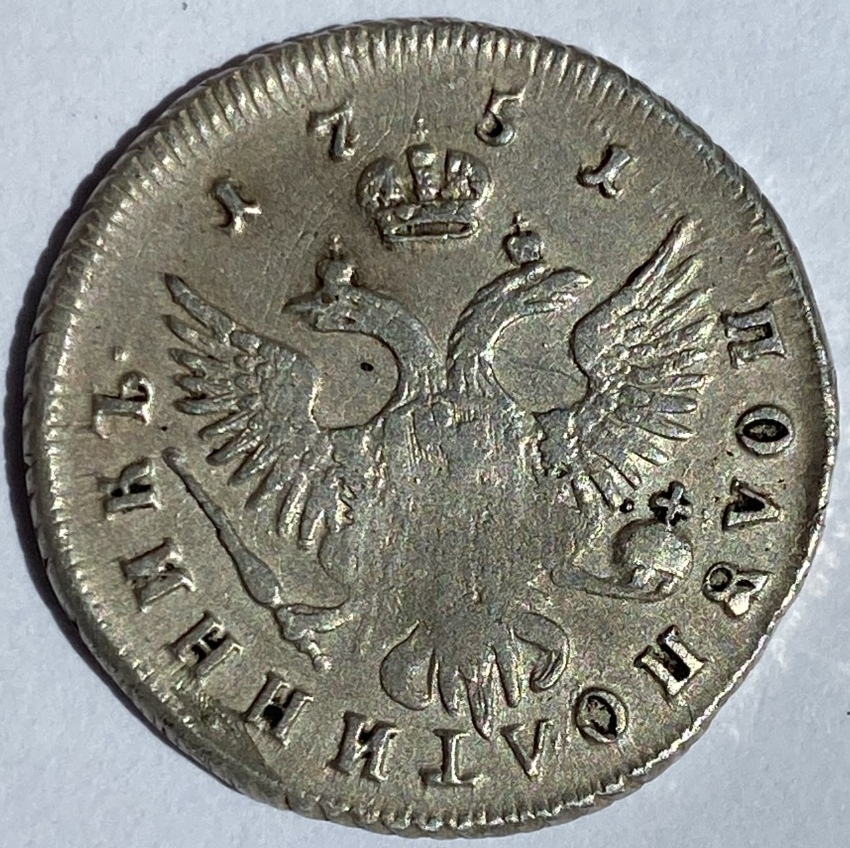 Монета представляет собой полуполтинник (25 копеек) 1751 года, отчеканенный на Московском монетном дворе (ММД) в правление императрицы Елизаветы Петровны. Это серебряная монета стандартного для того периода образца. Однако представленный экземпляр является современной подделкой, о чём прямо указано в посте и подтверждено консенсусом в комментариях.