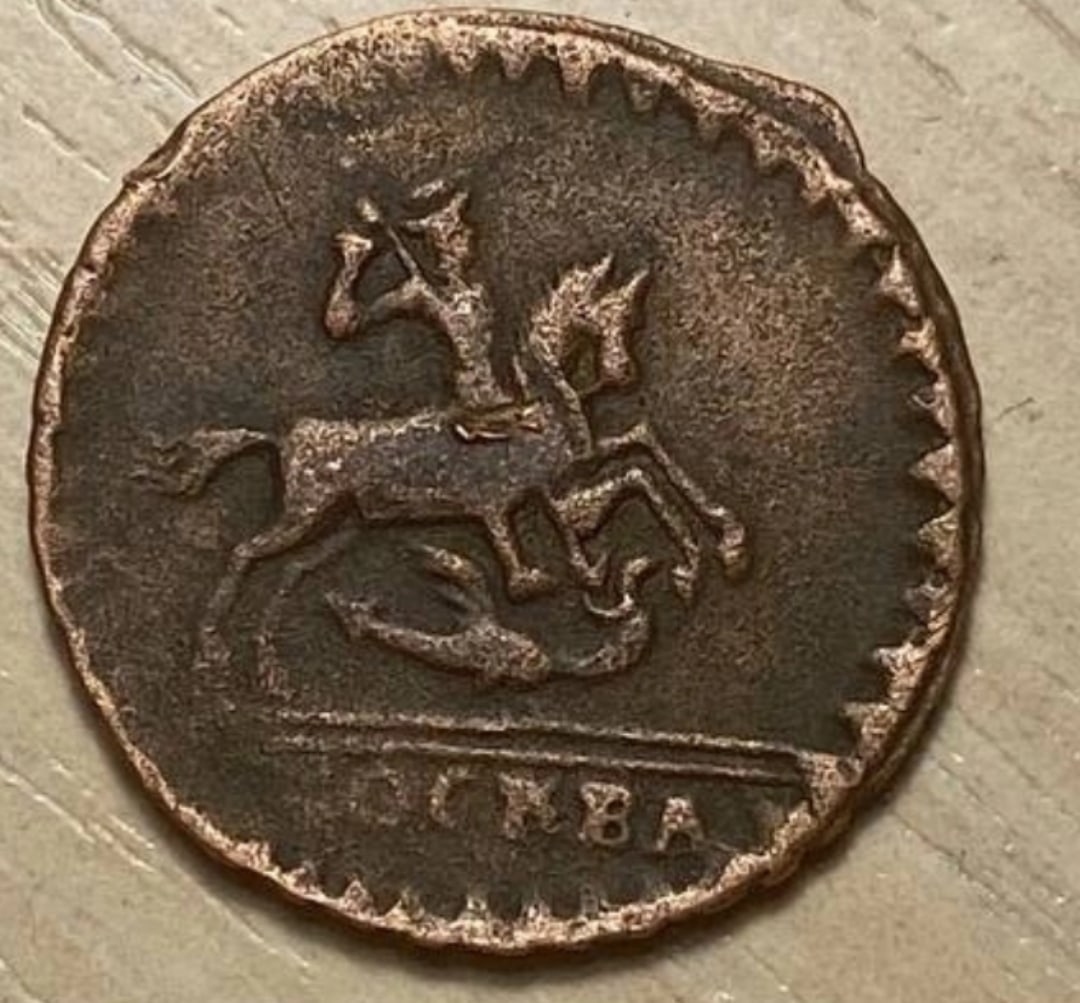 Медная копейка 1728 года, отчеканенная в правление императора Петра II. Монета данного типа имела широкое хождение, но представленный экземпляр является современной подделкой. Основной признак фальшивки — технология изготовления (литьё), что не соответствует оригинальной чеканке того периода.