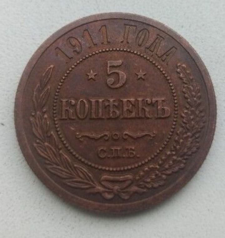 Медная монета номиналом 5 копеек, отчеканенная в 1911 году на Санкт-Петербургском монетном дворе в правление императора Николая II. Представленный экземпляр является современной подделкой, изготовленной методом литья. Оригинальные монеты этого типа массовы и недороги, что не останавливает фальшивомонетчиков.