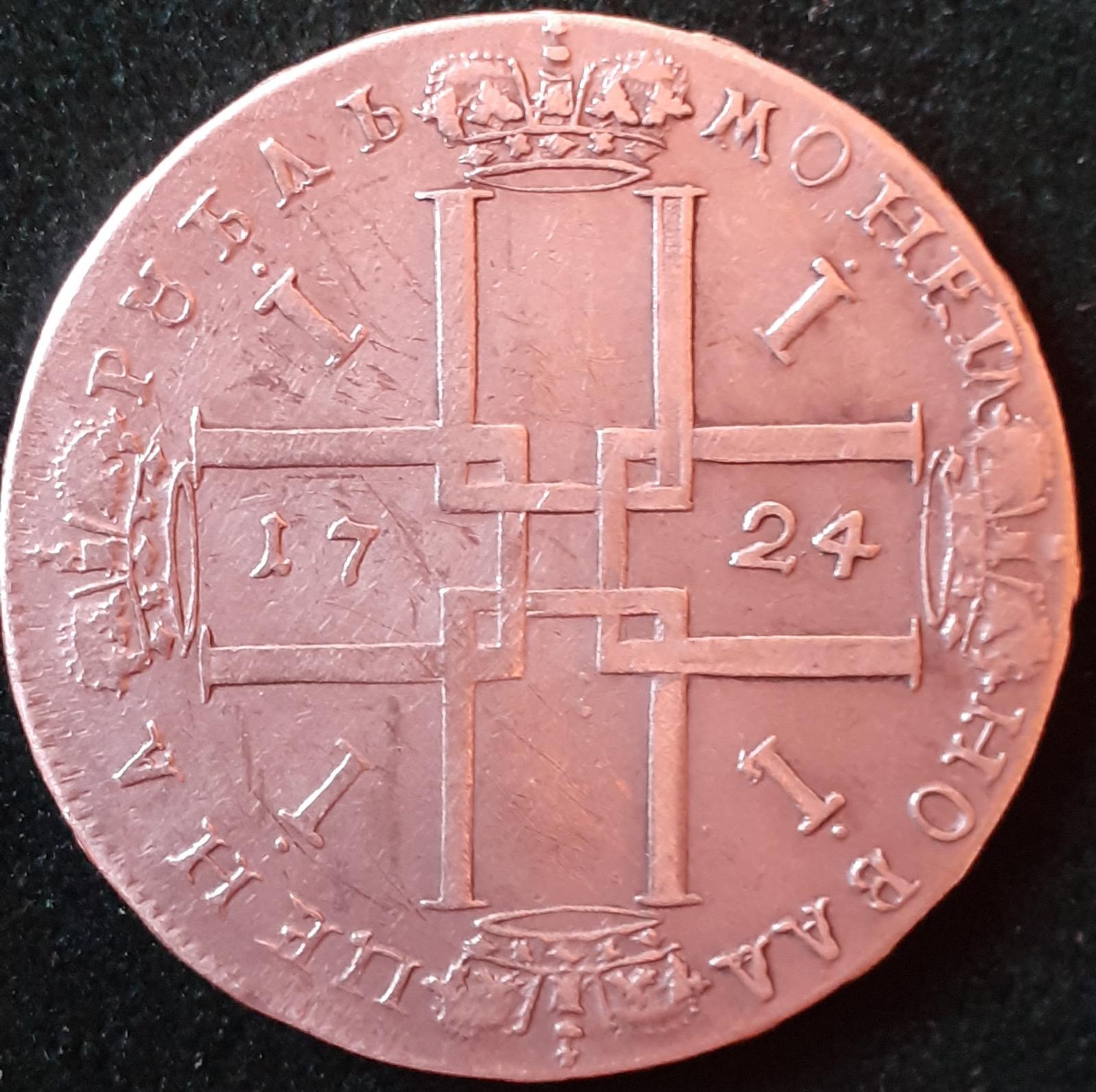 Монета представляет собой копию серебряного рубля 1724 года, отчеканенного в период правления Петра I. Оригинальные рубли этого года имеют высокую коллекционную ценность и встречаются редко. В посте автор прямо указывает, что это подделка, что является основным фактором для идентификации.