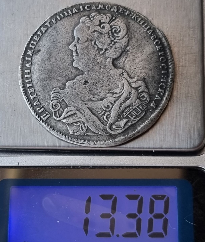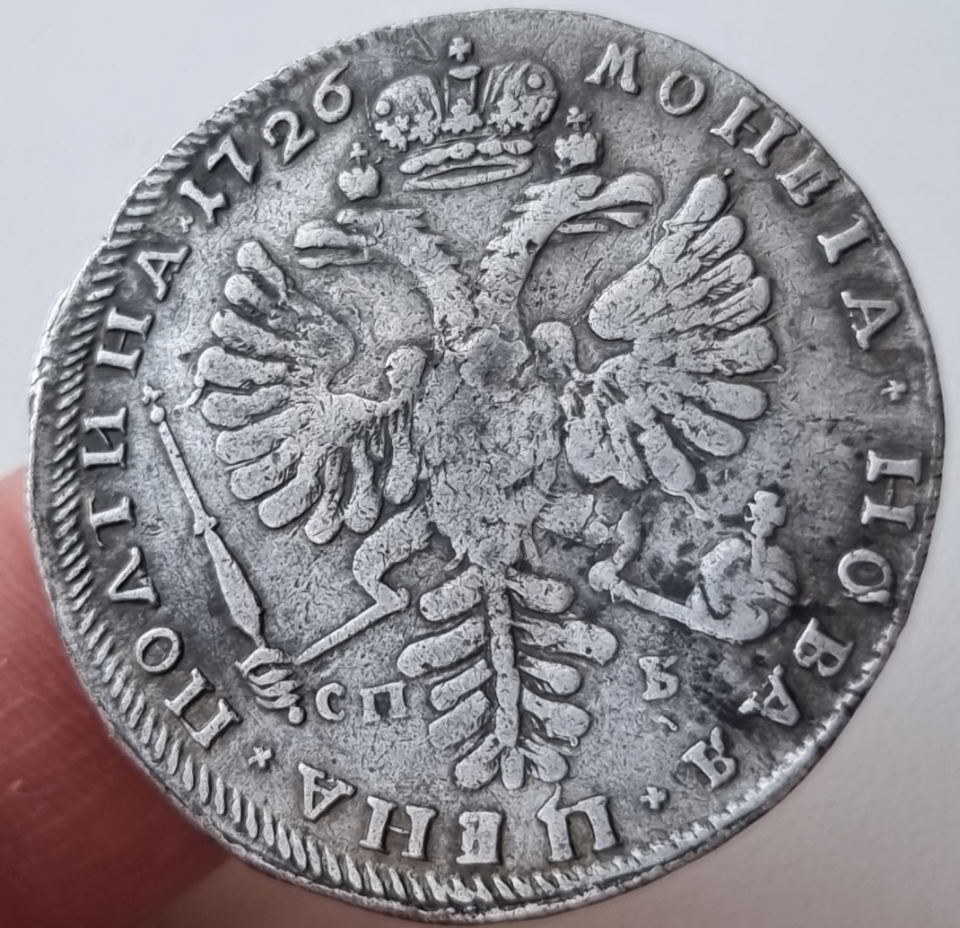 Монета представляет собой копию серебряной полтины 1726 года, отчеканенной в правление императрицы Екатерины I. Оригинальные монеты этого типа имеют высокую коллекционную ценность и сложны в изготовлении. В самом посте автор прямо указал, что это копия, что исключает возможность её происхождения как подлинного экземпляра.