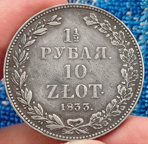 Монета 1 1/2 рубля — 10 злотых 1833 года отчеканена в период правления Николая I для обращения в Царстве Польском. Это оригинальная серебряная монета, выпущенная на Варшавском монетном дворе. Её аверс содержит портрет императора, а реверс — номинал и год в венке.