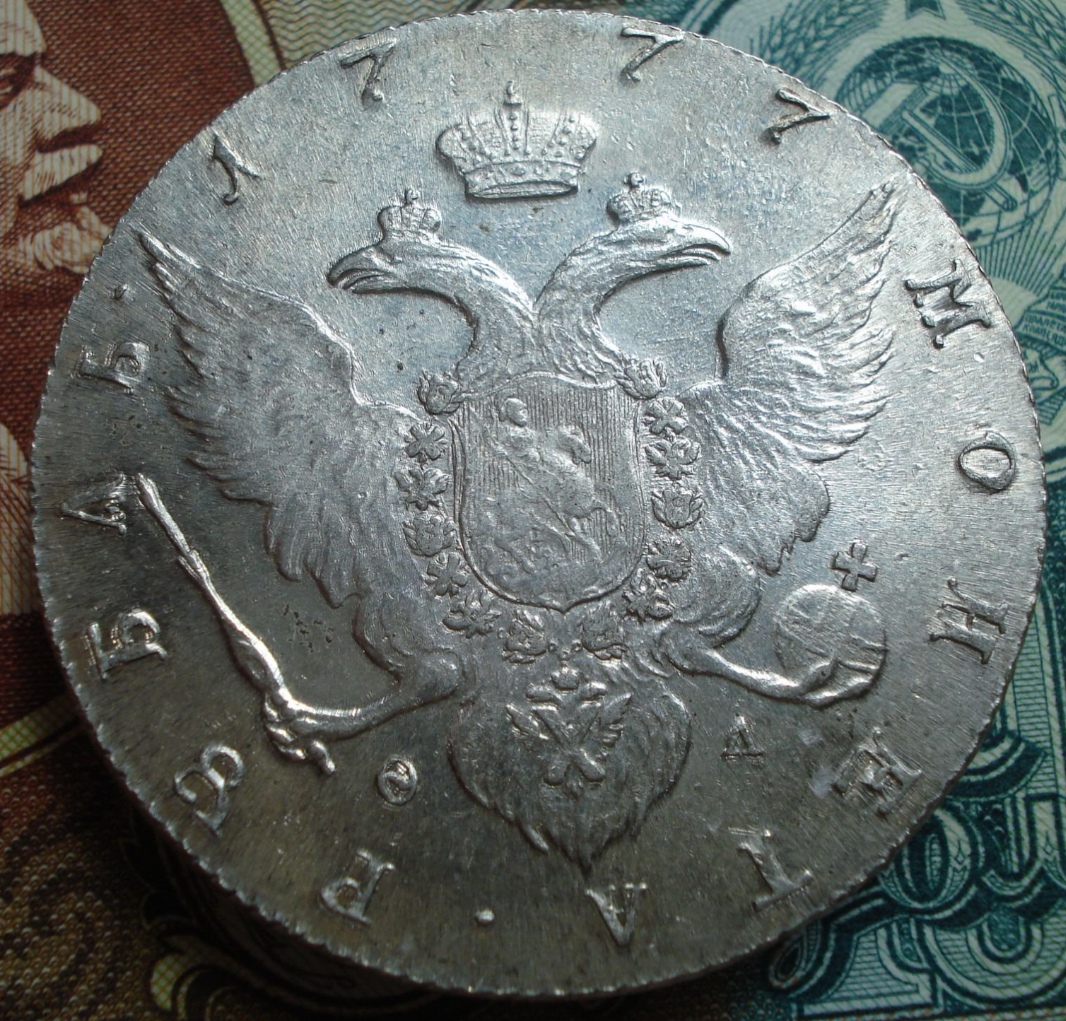 Монета представляет собой копию серебряного рубля Екатерины II 1777 года с инициалами минцмейстера Федора Леймана (СПБ ФЛ). В оригинале гурт рубля этого периода должен быть шнуровидным с наклоном влево. Представленный экземпляр является фейком, так как имеет несуществующий в природе гурт «змейкой», что сразу выдаёт подделку.