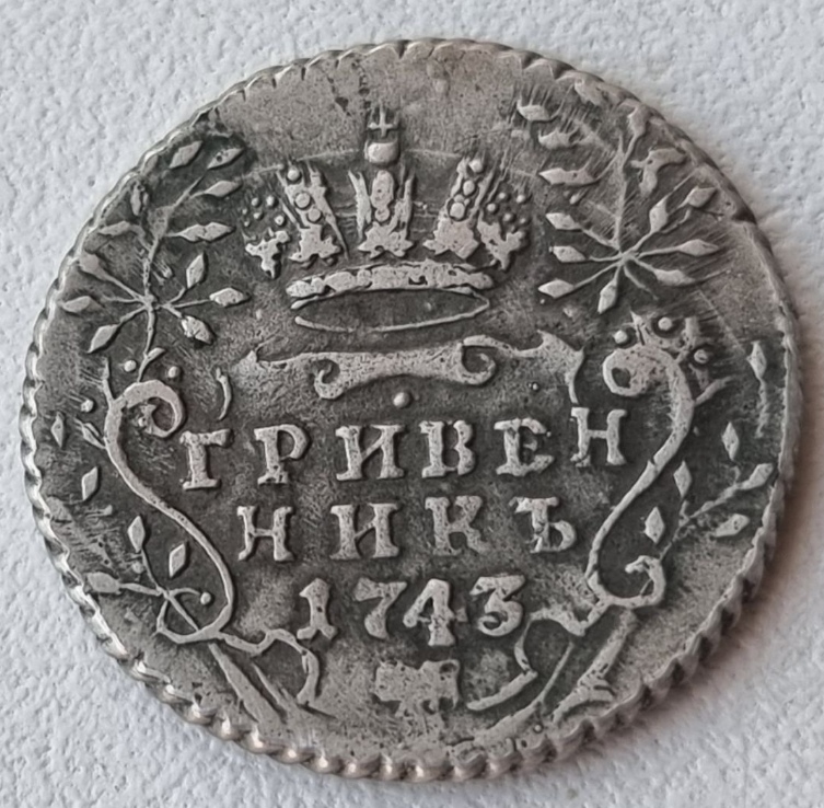 Монета представляет собой копию серебряного гривенника (10 копеек) Российской Империи 1743 года, отчеканенного в правление императрицы Елизаветы Петровны. Оригинальные монеты этого типа имеют высокую коллекционную ценность. Представленный экземпляр является современной литой подделкой, что отмечено как в описании поста, так и в комментариях сообщества.