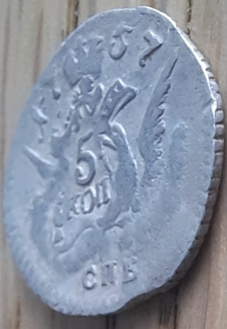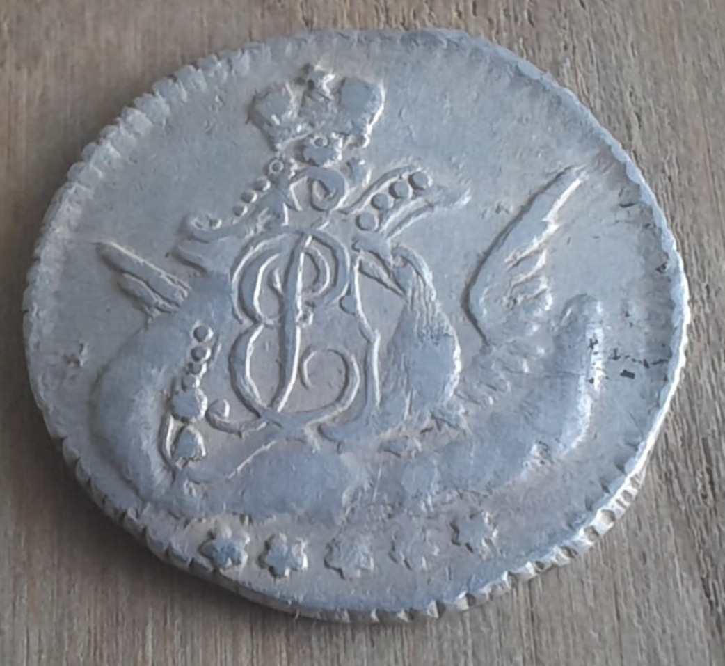 Монета номиналом 5 копеек 1757 года, отчеканенная в Санкт-Петербурге в период правления императрицы Елизаветы Петровны. Несмотря на внешнюю схожесть, монета признана фейком. Это современная копия, не имеющая нумизматической ценности.