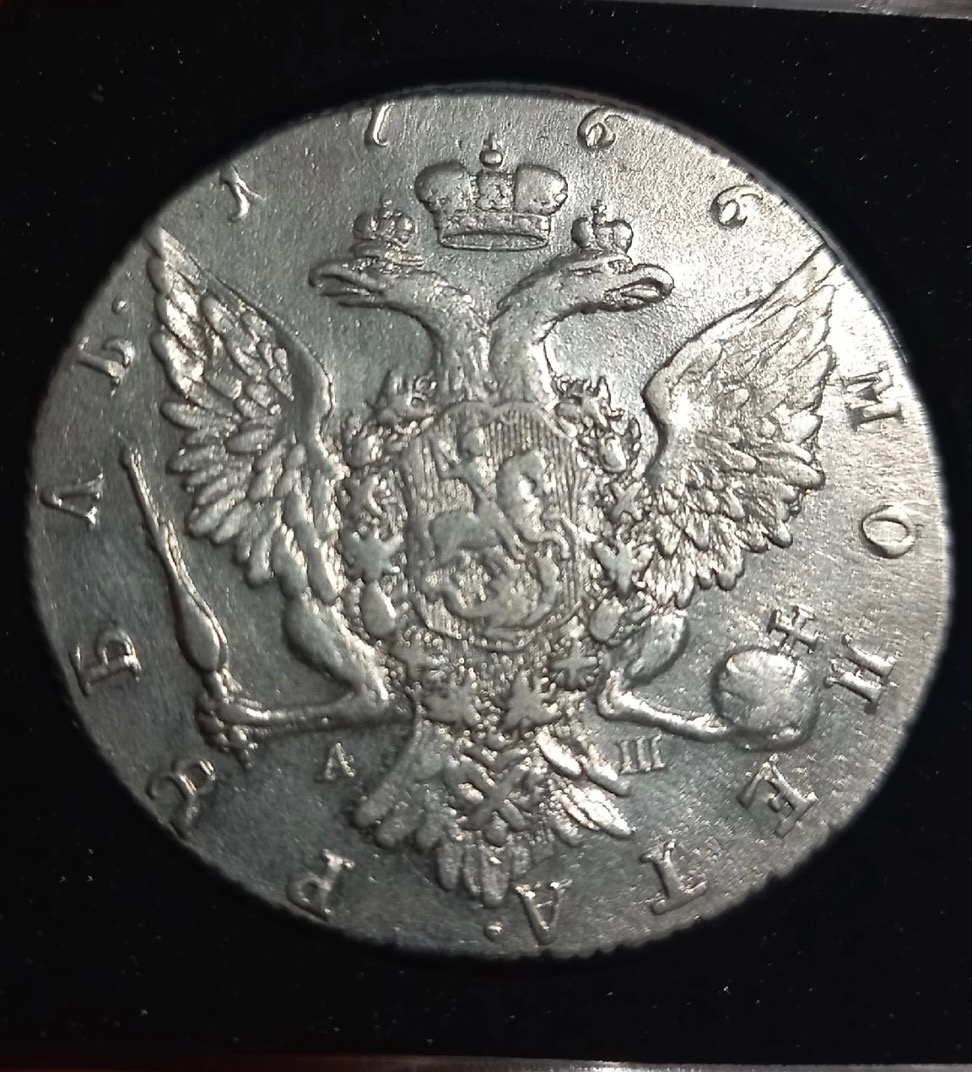 Монета представляет собой копию серебряного рубля 1766 года, отчеканенного в Санкт-Петербурге при Екатерине II (инициалы минцмейстера Афанасия Шемякина — «АШ»). В комментариях сообщества эксперты единогласно признали её подделкой, указав на признаки литья и неестественный вид металла, характерный для сувенирных копий.