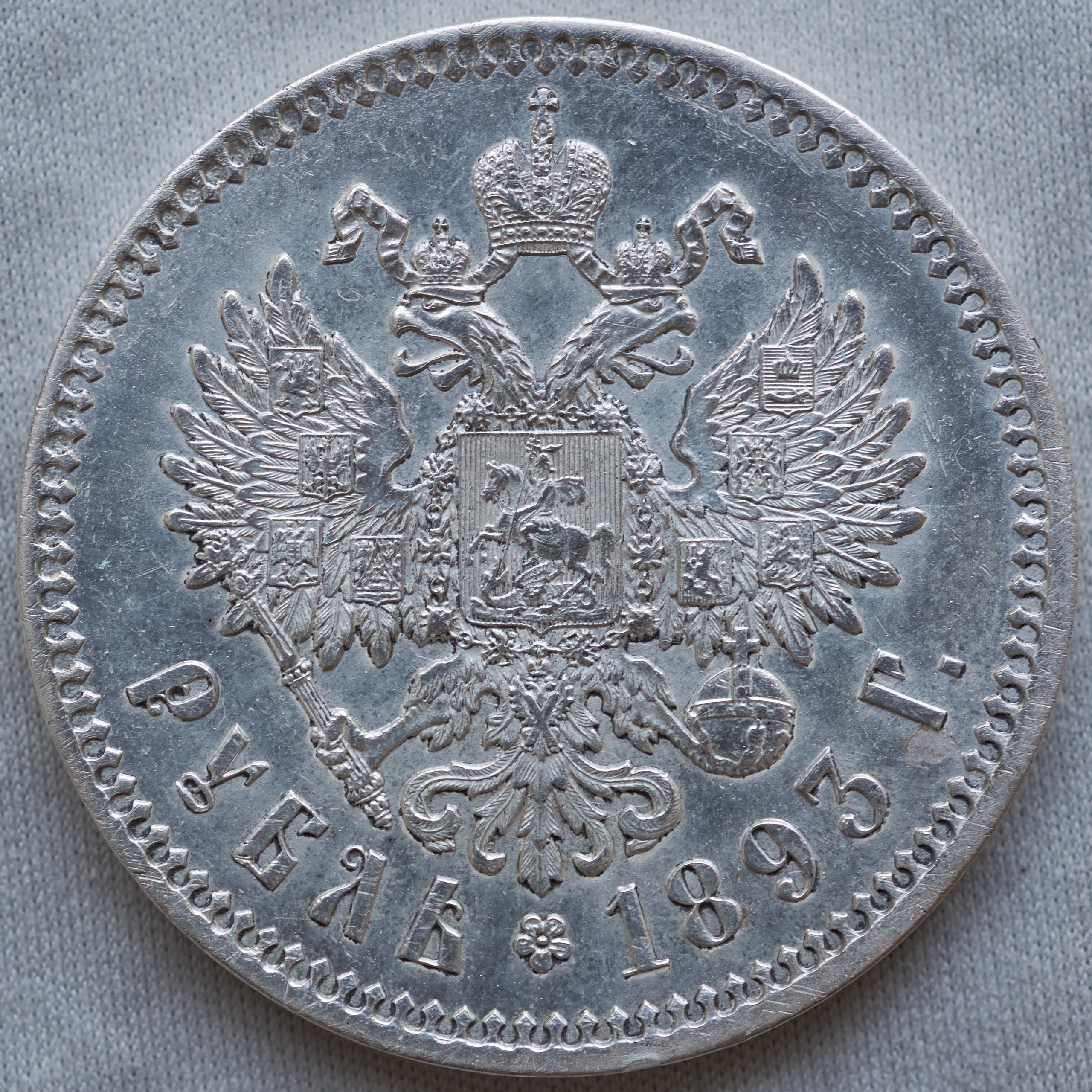 Монета номиналом 1 рубль 1893 года, отчеканенная в правление императора Александра III. Несмотря на качественную деталировку аверса, монета признана подделкой из-за характерных дефектов гурта, несоответствия шрифта и сомнительной технологии изготовления. Это типичный пример высококачественной копии, вводящей в заблуждение коллекционеров.