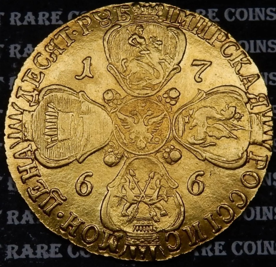 Монета представляет собой копию золотого империала (червонца) 10 рублей 1766 года, отчеканенного на Санкт-Петербургском монетном дворе в период правления Екатерины II. Оригинальные монеты этого типа высоко ценятся коллекционерами. В посте автор прямо указывает, что это копия, что делает её современной репликой, сувениром или подделкой, не имеющей нумизматической ценности.