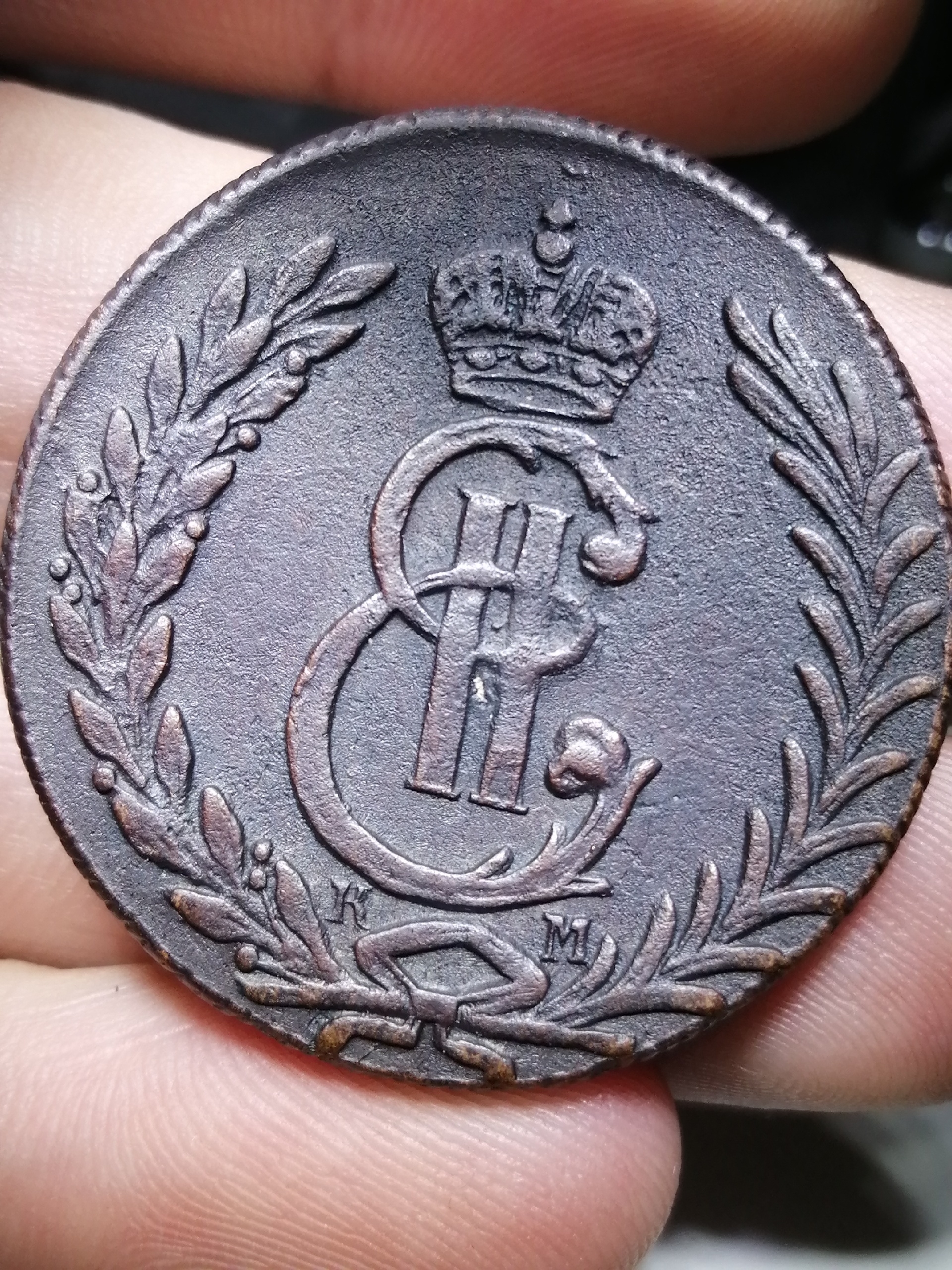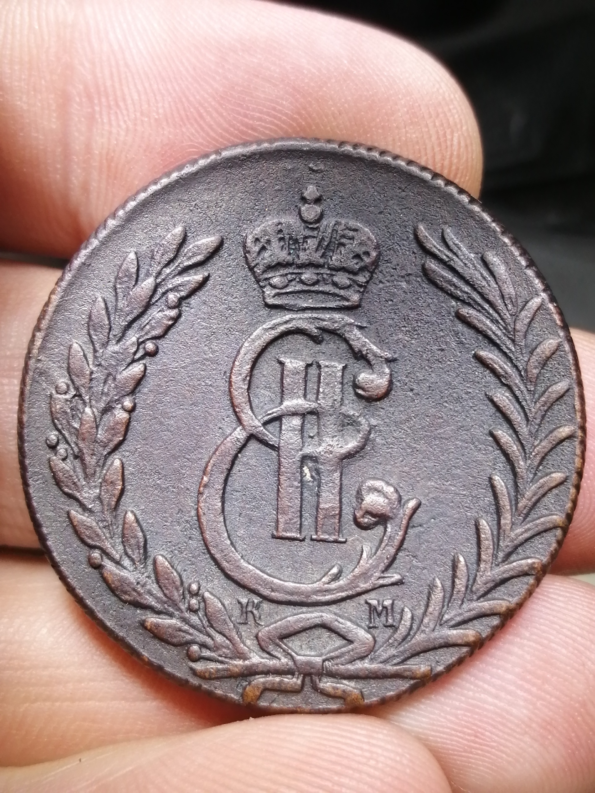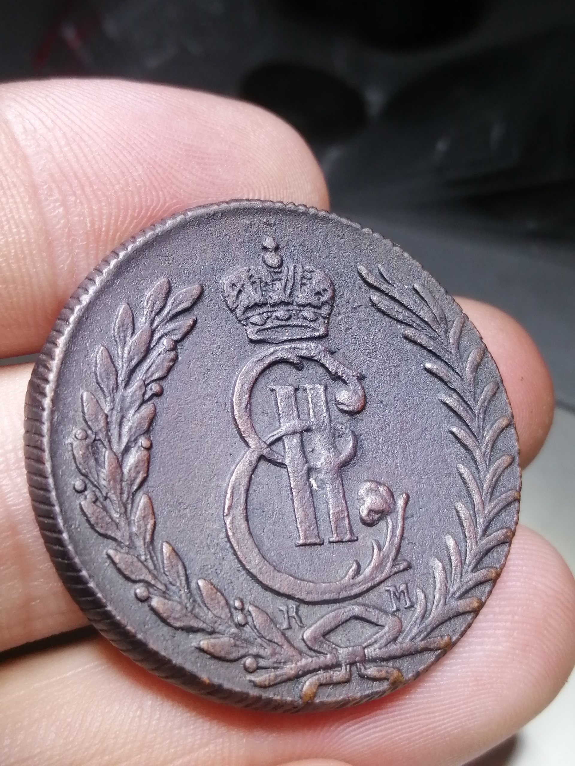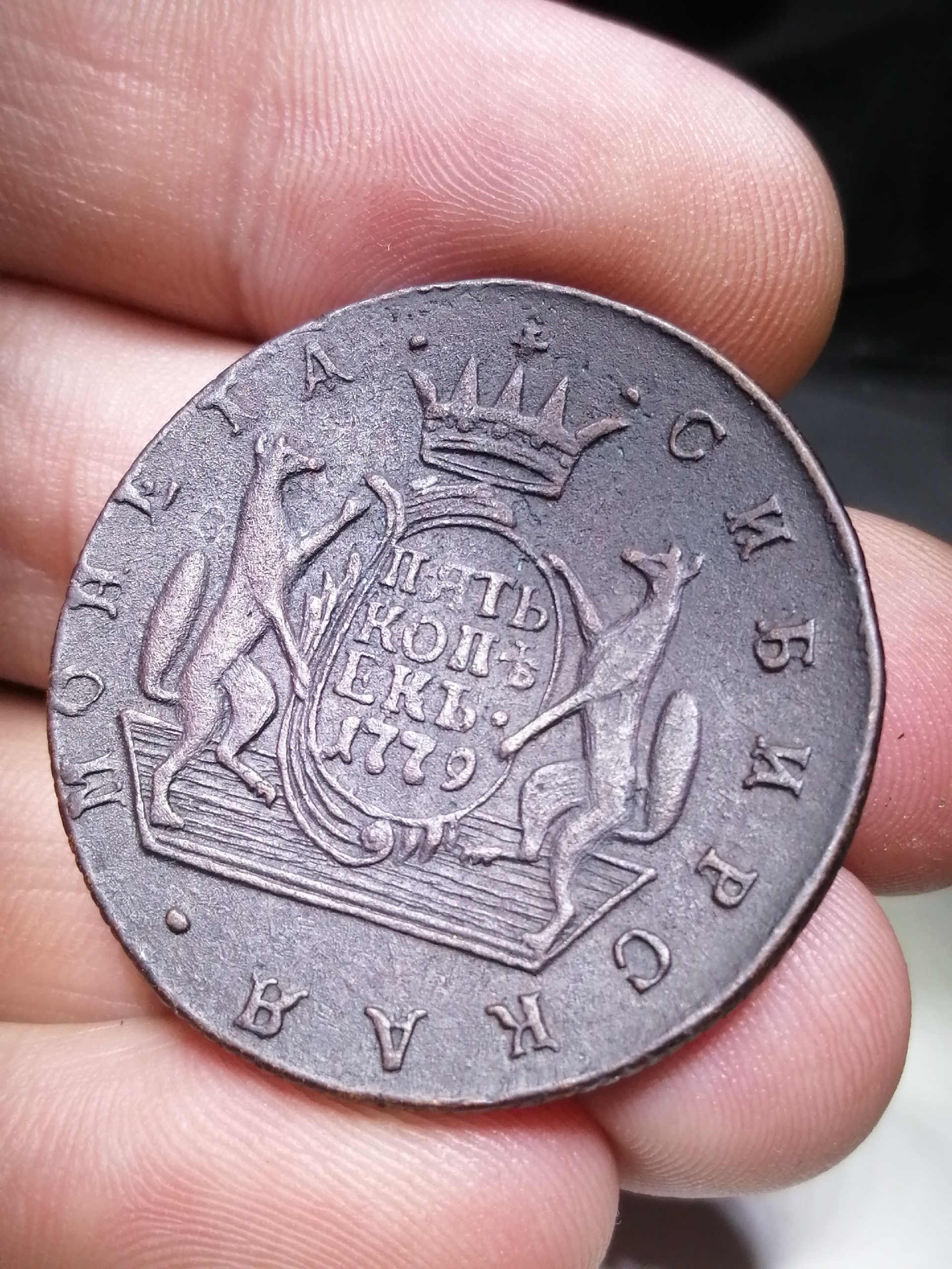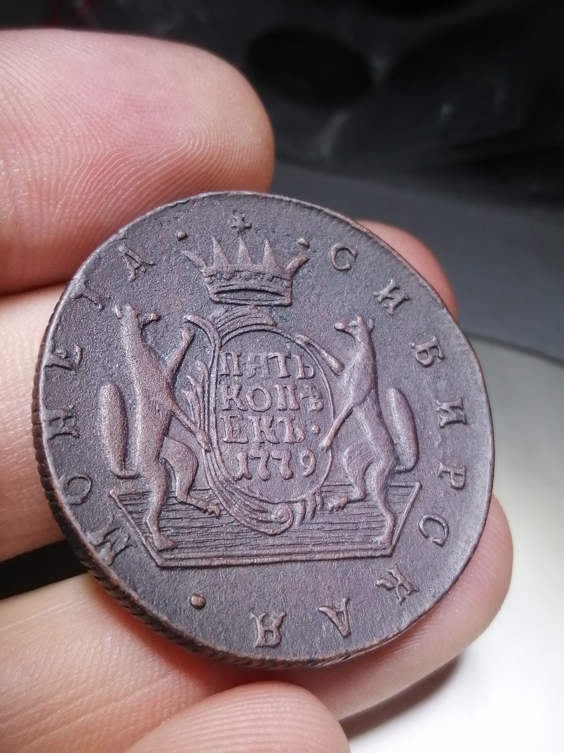 Монета 5 копеек 1779 года, отчеканенная в правление Екатерины II. Несмотря на внешнюю сохранность, эксперты выявили признаки литья: рыхлое поле, равномерная коррозия, отсутствие следов чеканки и жёлтый цвет металла, нехарактерный для оригинальной бронзы. Монета признана качественной современной копией.