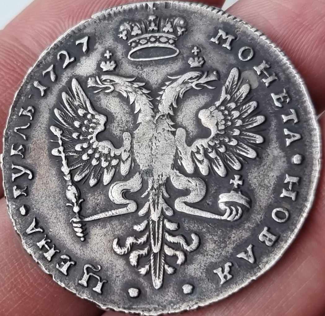 Монета представляет собой копию серебряного рубля 1727 года, выпущенного в период правления императрицы Екатерины I. Оригинальные рубли этого года чеканились на Красном монетном дворе в Москве и являются редкими и ценными. В данном случае автор поста прямо указал, что это копия, что исключает её подлинность.