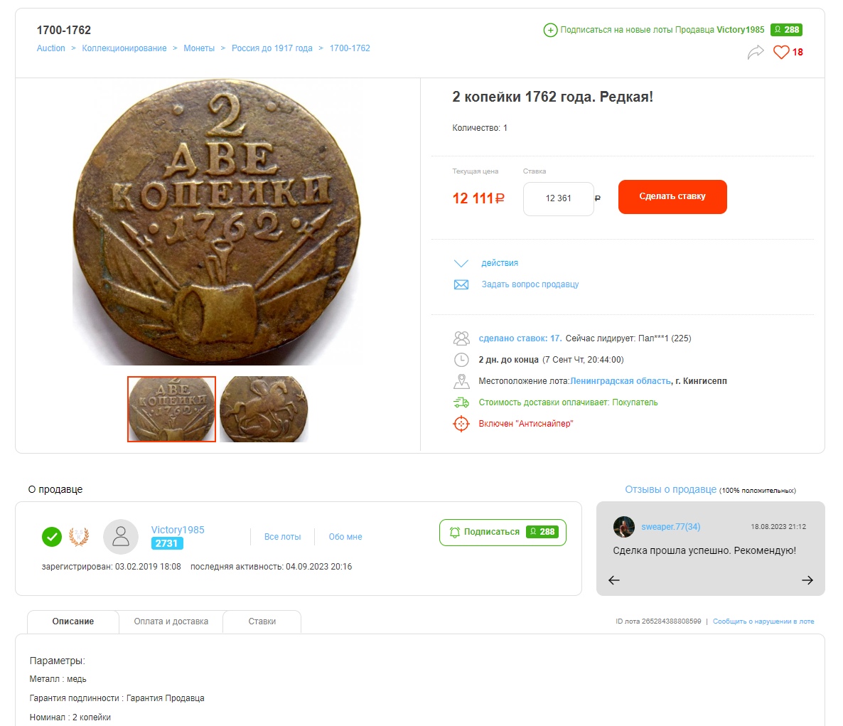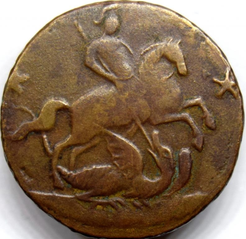 Монета номиналом 2 копейки 1762 года, отчеканенная в период короткого правления императора Петра III. Оригинальные монеты этого типа чеканились из меди на Санкт-Петербургском монетном дворе. Представленный экземпляр является подделкой, что очевидно по материалу и отсутствию характерных признаков подлинника.