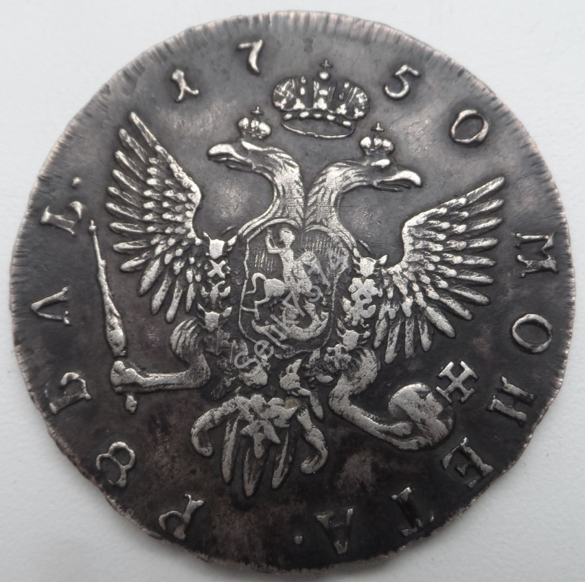 Монета представляет собой подделку серебряного рубля 1750 года, отчеканенного при императрице Елизавете Петровне на Санкт-Петербургском монетном дворе (обозначение СПБ). Оригинальные рубли этого периода имеют высокую коллекционную ценность, что делает их частой мишенью для фальсификаторов. Данный экземпляр, как указано в посте, является репликой, не имеющей нумизматической ценности.
