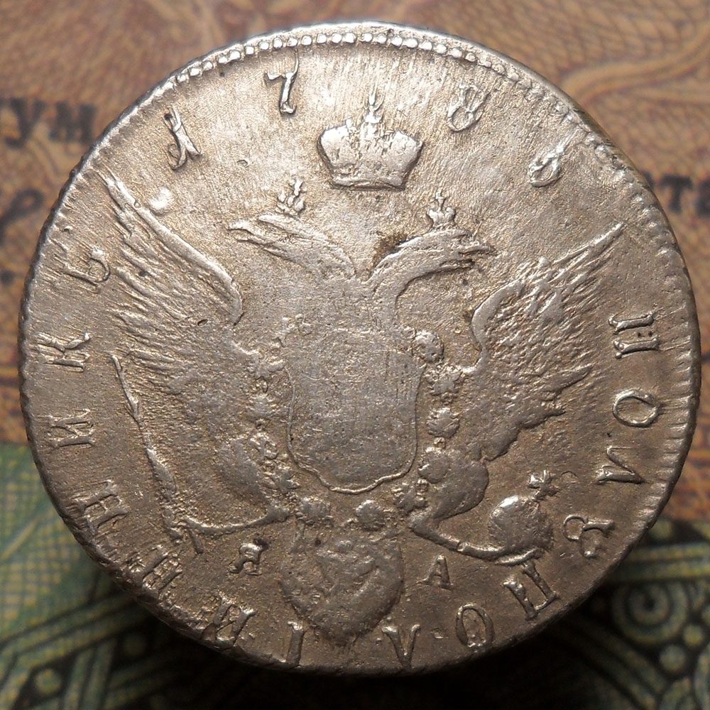 Монета номиналом полуполтинник (25 копеек) была отчеканена в 1785 году в правление императрицы Екатерины II на Санкт-Петербургском монетном дворе (обозначение СПБ). Согласно исходному посту, представленный экземпляр является копией, что означает его непринадлежность к числу подлинных монет Российской Империи.