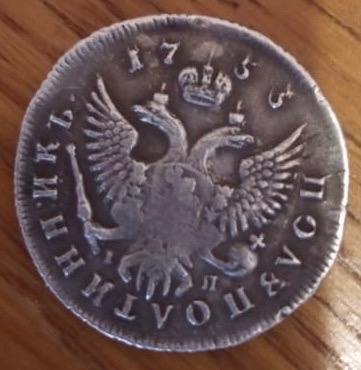 Полуполтинник (25 копеек) 1753 года с монограммой Елизаветы Петровны и знаком Московского монетного двора (ММД). Монета периода правления императрицы Елизаветы Петровны, отчеканенная из серебра. Представленный экземпляр является фальшивкой, часто встречающейся на рынке.