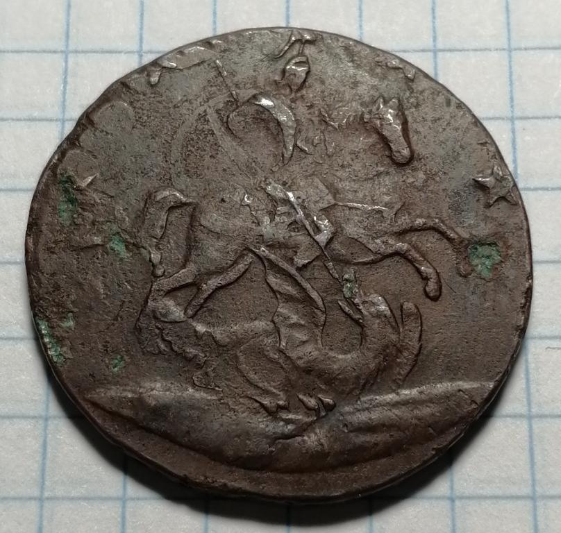 Монета номиналом 4 копейки, отчеканенная в 1762 году — первом году правления императрицы Екатерины II. Несмотря на хорошее качество исполнения, представленный экземпляр является современной копией, о чём прямо указано в описании поста. Такие реплики часто создаются для коллекционеров, интересующихся историей, но не готовых платить за подлинник.