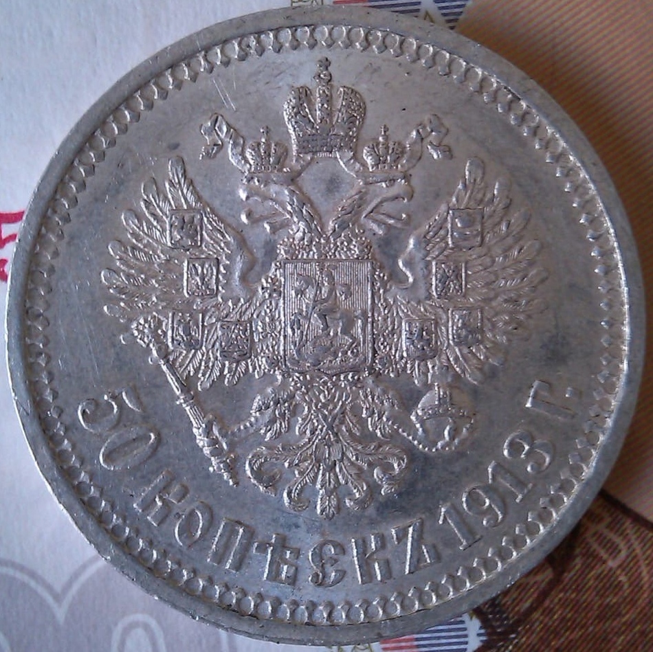Серебряная монета номиналом 50 копеек (полтина) 1913 года, отчеканенная в правление императора Николая II. Относится к массовому типу монет Российской Империи с портретом императора в мундире. На основании анализа аверса и реверса, представленных на фото, большинство экспертов в комментариях не видят признаков подделки.