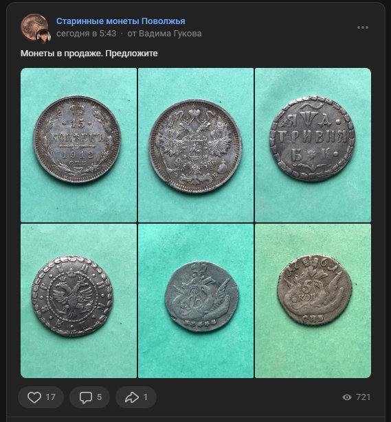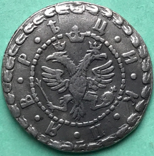 Серебряная гривна 1704 года, отчеканенная в правление Петра I. Это одна из первых монет регулярного чекана Российской империи. Представленный экземпляр является подделкой, о чём прямо указано в посте и подтверждено комментаторами.