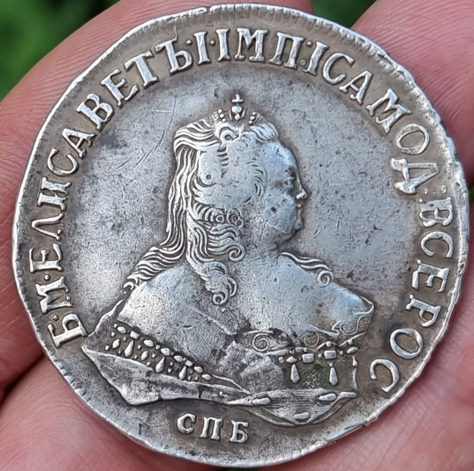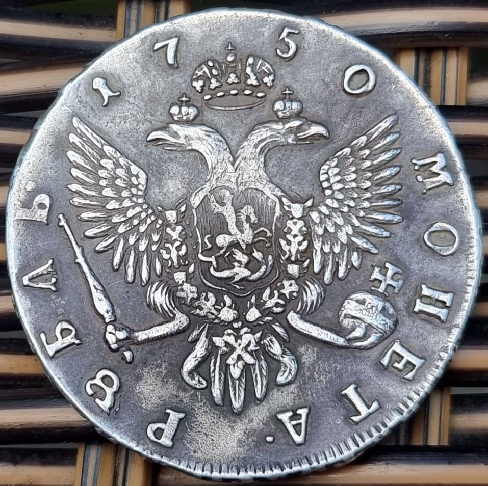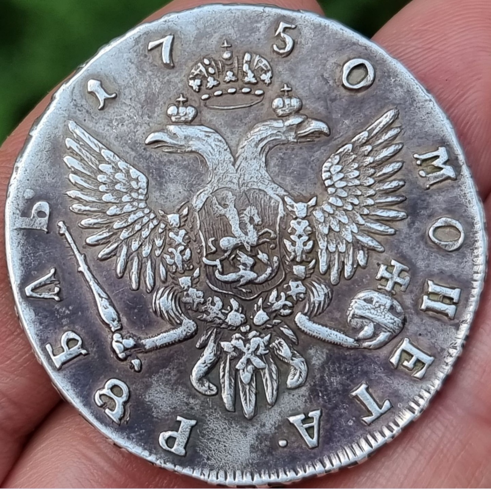 Монета представляет собой копию серебряного рубля 1750 года, отчеканенного при императрице Елизавете Петровне на Санкт-Петербургском монетном дворе (обозначение СПБ). Оригинальные рубли этого периода являются редкими и ценными коллекционными предметами. Владелец прямо указал, что это копия, что исключает её статус как подлинного нумизматического объекта.