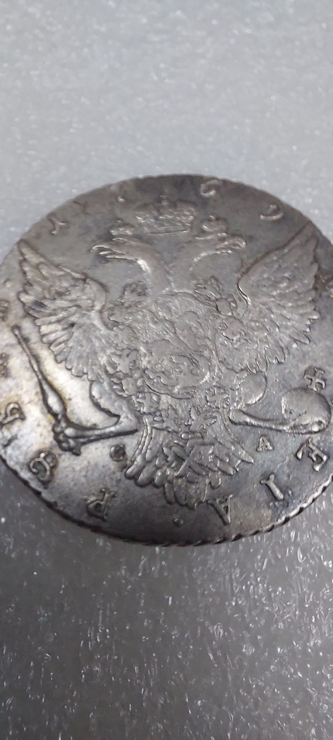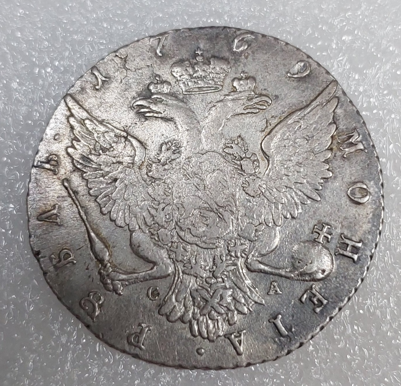 Серебряный рубль 1769 года с вензелем Екатерины II, отчеканенный на Санкт-Петербургском монетном дворе (обозначение СПБ). Монета периода правления императрицы Екатерины Великой. Определение подлинности по предоставленным фотографиям вызывает споры среди экспертов.