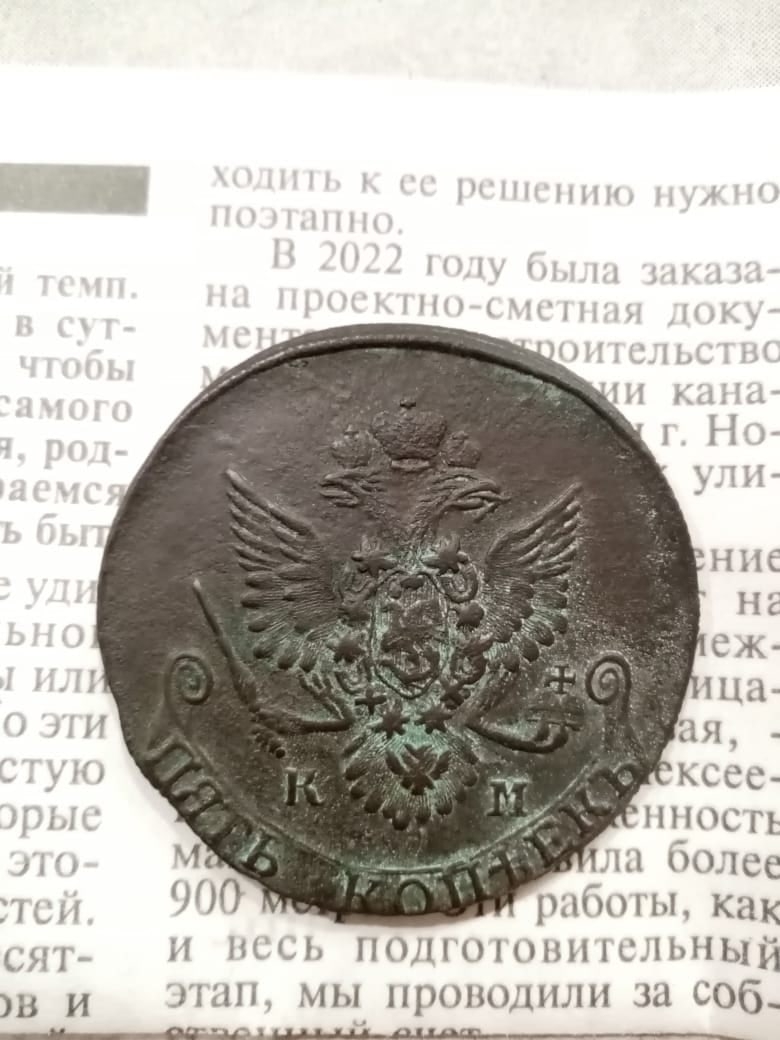Медная монета номиналом 5 копеек, отчеканенная в 1783 году в период правления императрицы Екатерины II. Данный тип монет (сибирская монета, КМ) чеканился на Колыванском монетном дворе из меди Колыванских рудников. Судя по консенсусу в комментариях, представленный экземпляр является подлинным.