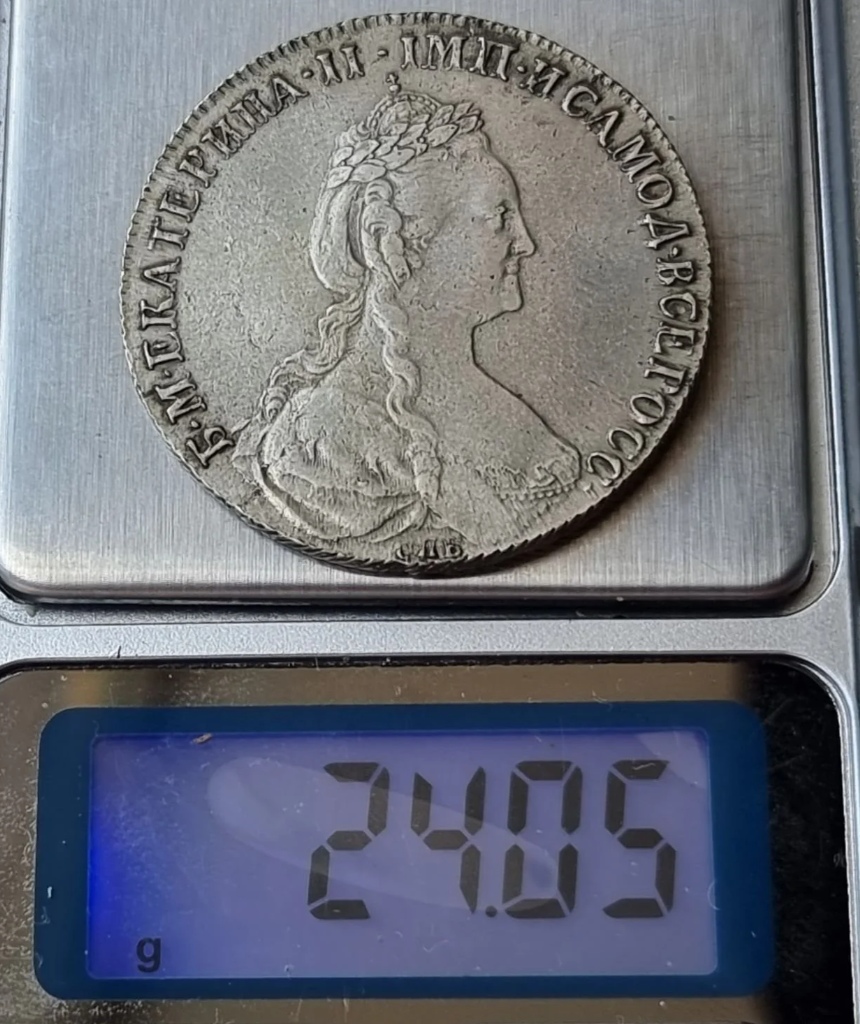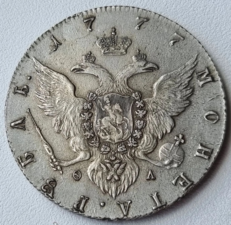 Монета представляет собой копию серебряного рубля 1777 года, отчеканенного при Екатерине II на Санкт-Петербургском монетном дворе (обозначение СПБ). Несмотря на внешнюю привлекательность, это современная подделка, выполненная методом литья. Оригинальные рубли этого периода имеют высокую коллекционную ценность и отличаются чёткостью деталей, которой не хватает данной реплике.