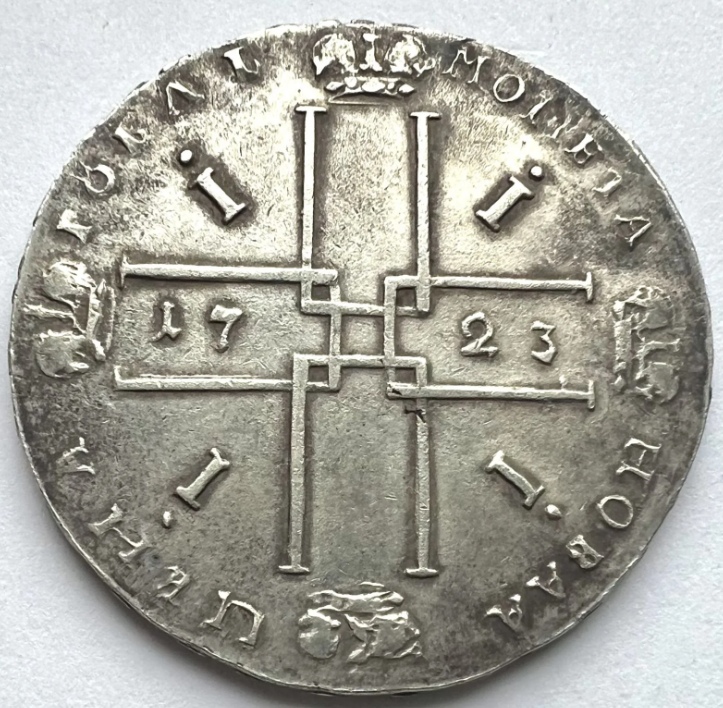 Монета представляет собой копию серебряного рубля 1723 года, отчеканенного в период правления Петра I. Оригинальные рубли этого года имеют высокую коллекционную ценность и сложны в приобретении. В посте автор прямо указывает, что это копия, что делает монету современной репликой, не имеющей нумизматической ценности.