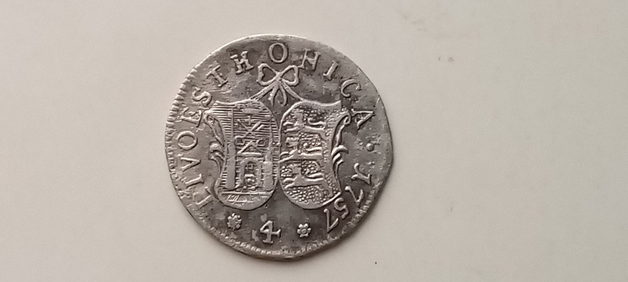 Медная монета номиналом 4 копейки, отчеканенная в 1757 году для обращения на присоединённых территориях Лифляндии и Эстляндии (так называемый "ливонез") в правление императрицы Елизаветы Петровны. Монета является оригинальной, что подтверждается консенсусом экспертного сообщества. Данный тип представляет исторический интерес как региональная монетная эмиссия Российской Империи.