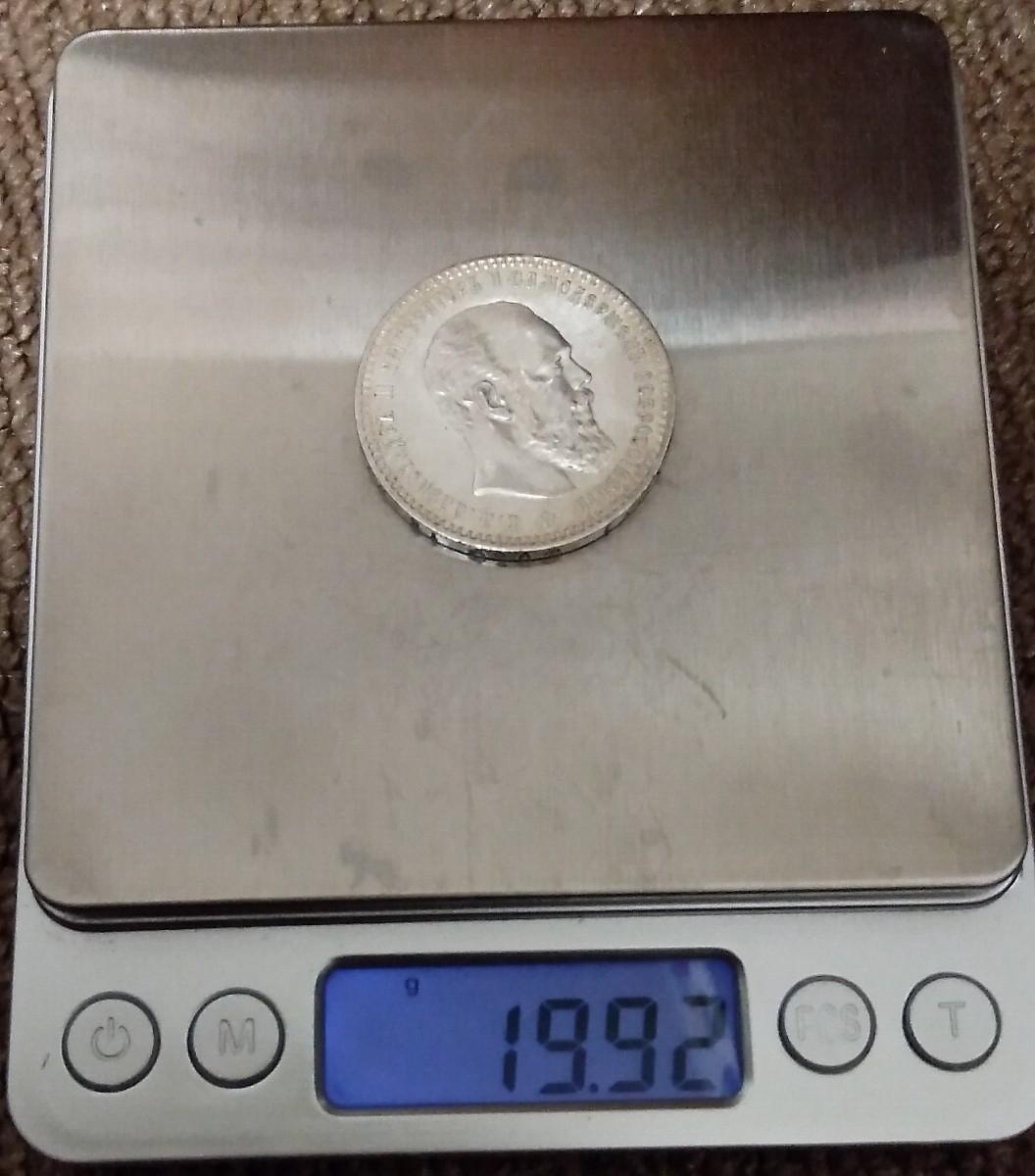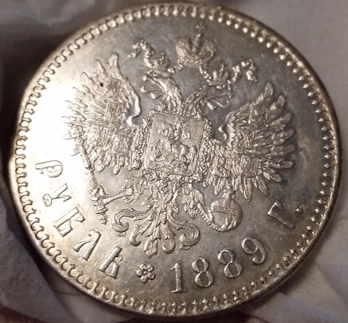Серебряный рубль 1889 года, отчеканенный в период правления императора Александра III. Монета является высококачественной современной копией, которую легко принять за подлинник. Отличия от оригинала заметны лишь эксперту в деталях гурта, весе и микроскопических несоответствиях в цифрах даты.