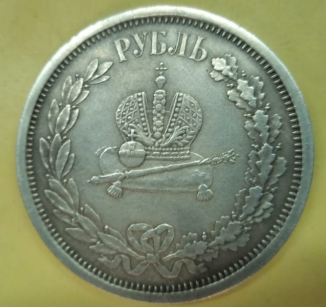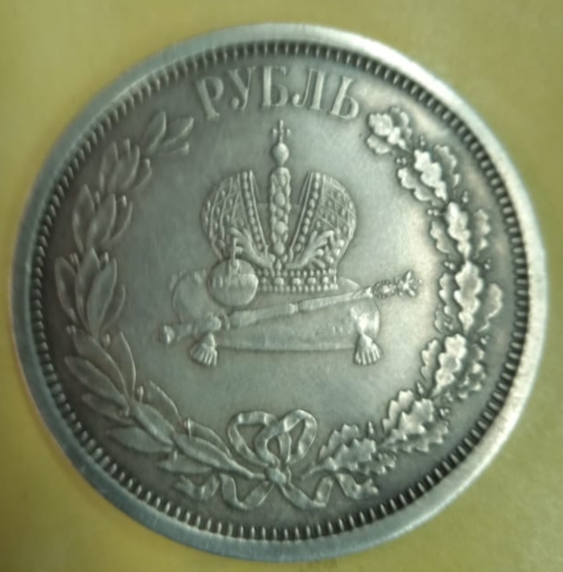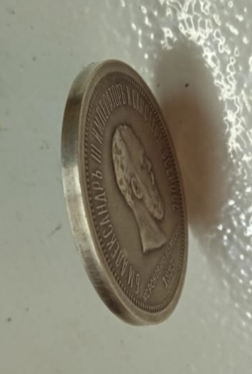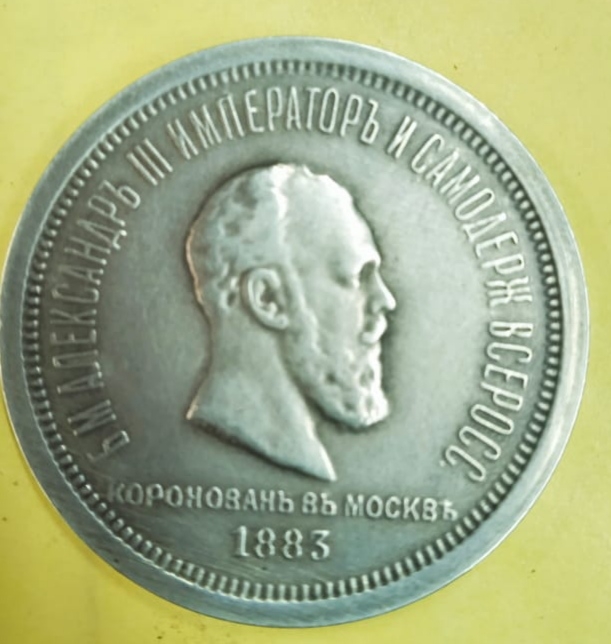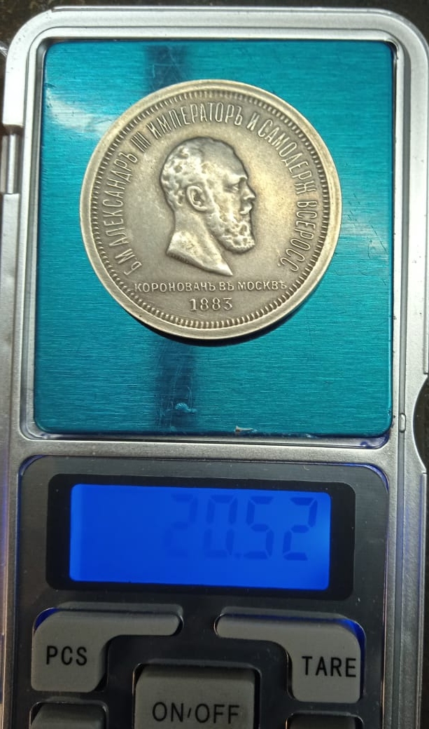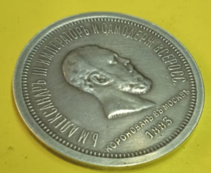 Монета посвящена коронации императора Александра III. Оригинальный рубль 1883 года чеканился из серебра и имеет сложный рельефный портрет. Представленный экземпляр признан фейком из-за несоответствия шрифта, смазанных деталей портрета и наведённой патины.