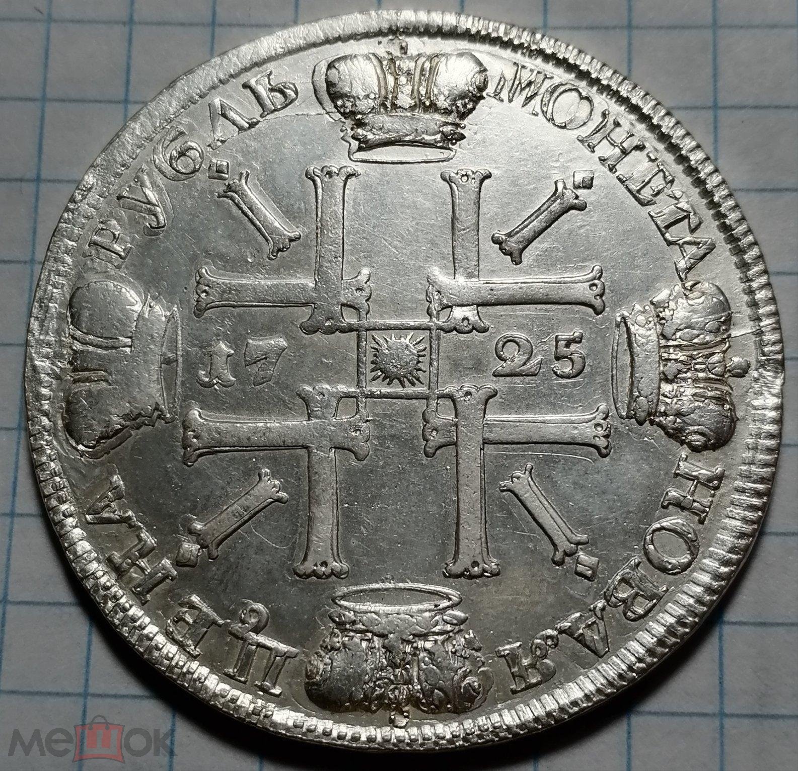 Монета представляет собой копию серебряного рубля 1725 года, отчеканенного в Санкт-Петербурге в период правления Екатерины I. Оригинальные монеты этого типа, известные как «солнечники» из-за характерного портрета императрицы, являются редкими и ценными. Представленный экземпляр является современной репликой, о чём прямо указано в посте и подтверждено ироничными комментариями сообщества.