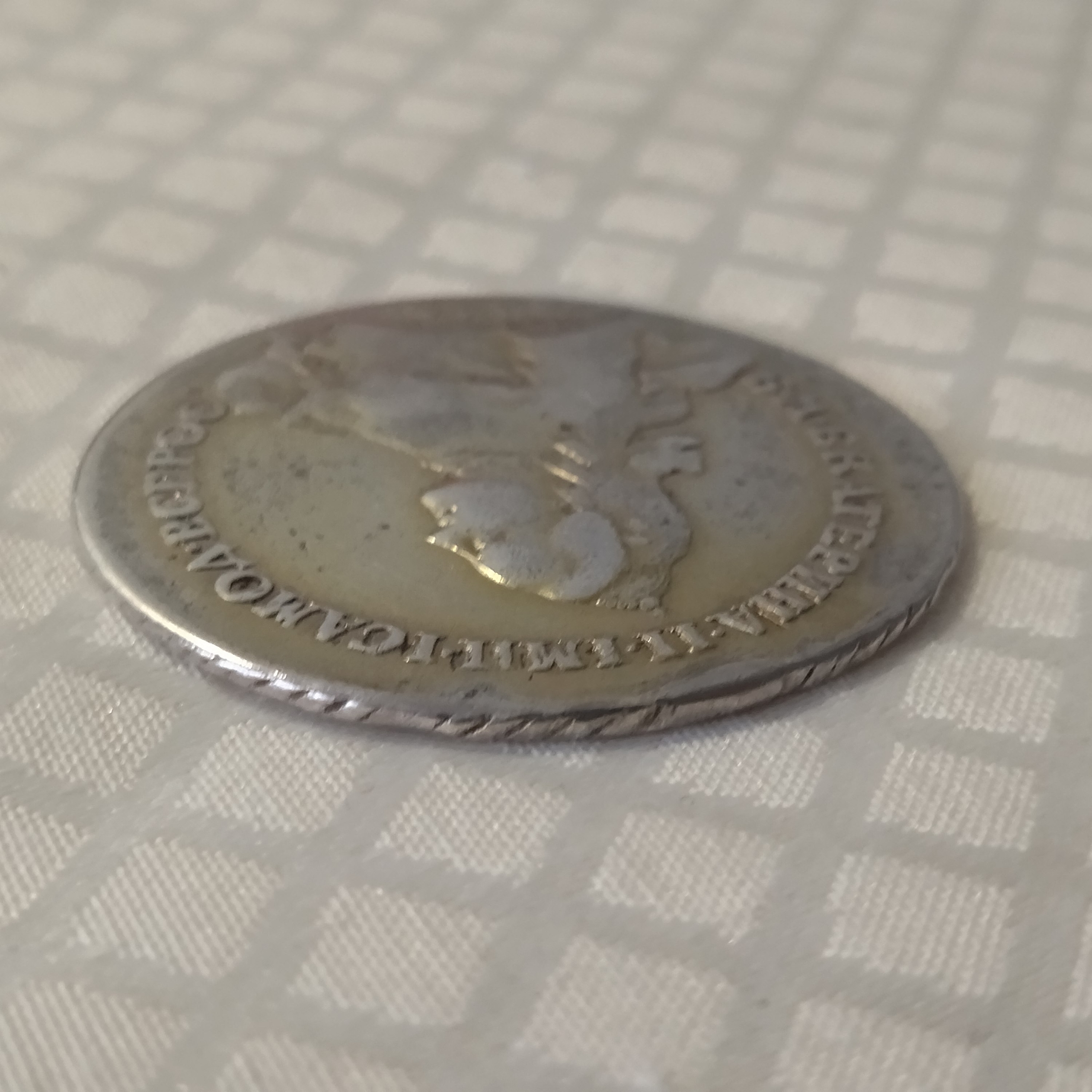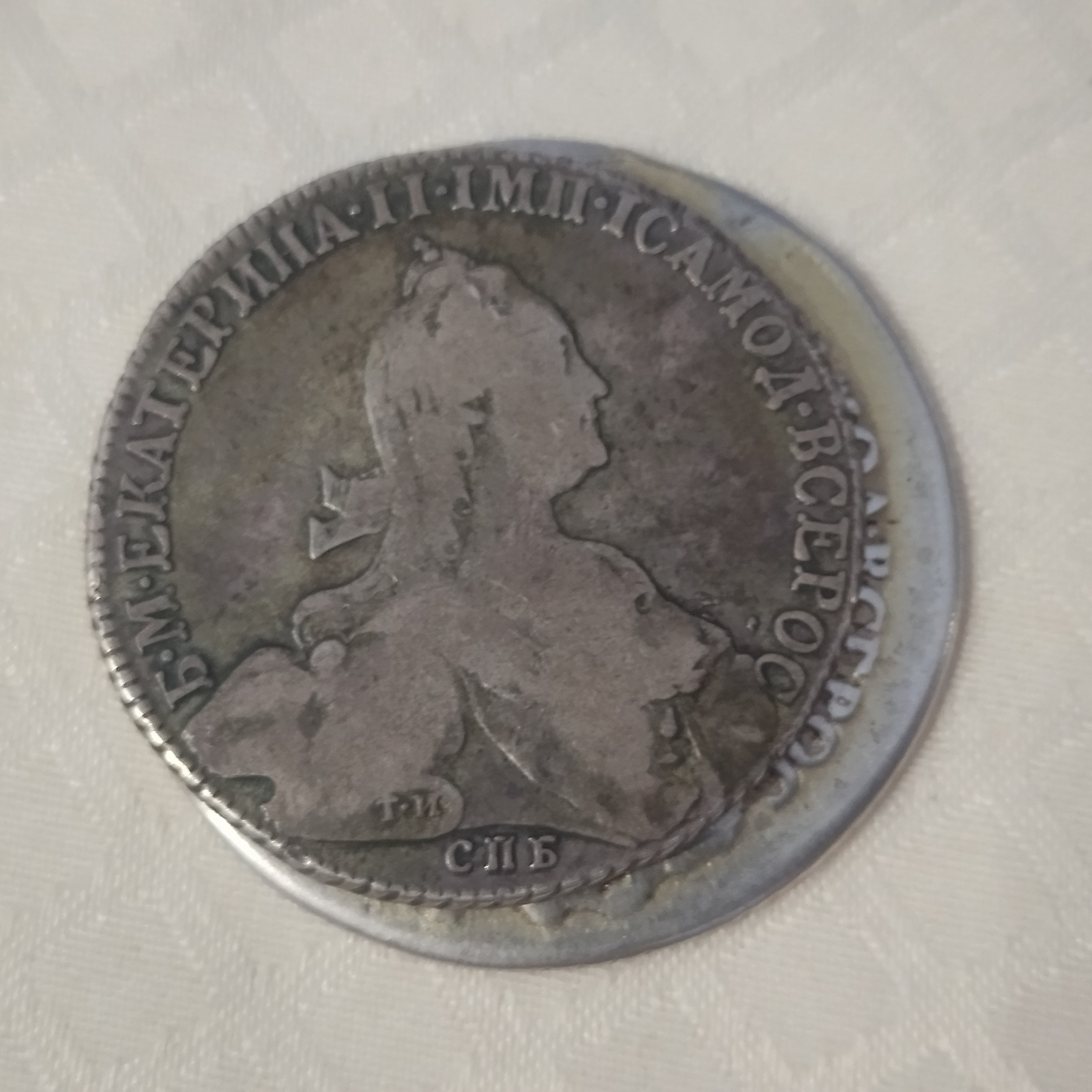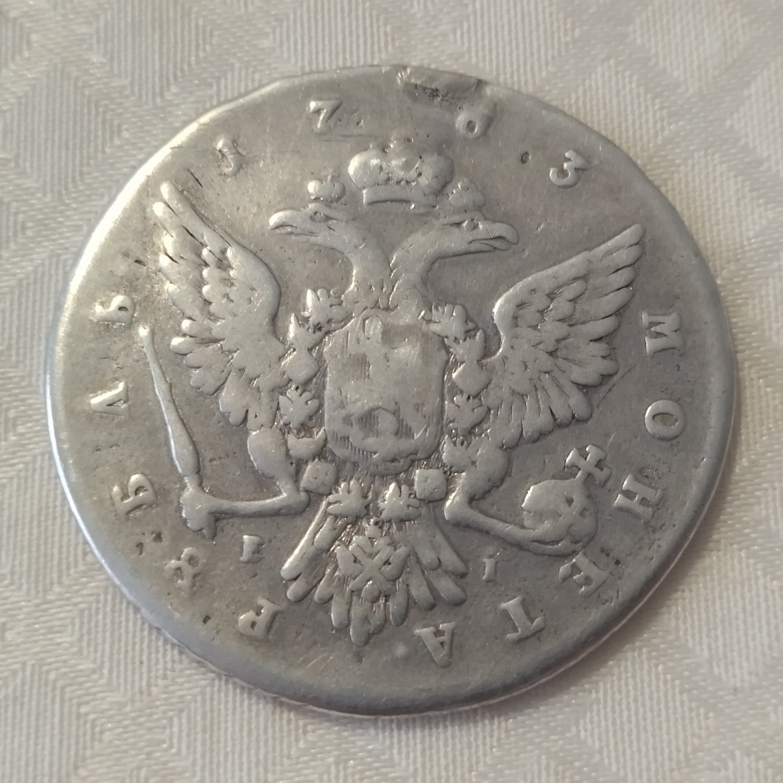 Серебряный рубль 1763 года, отчеканенный в правление Екатерины II. Монета является перечеканом из рубля 1762 года, что объясняет её увеличенный диаметр. Эксперты признают её подлинной, отмечая следы утёртости и возможного бытования в качестве украшения (монисто).