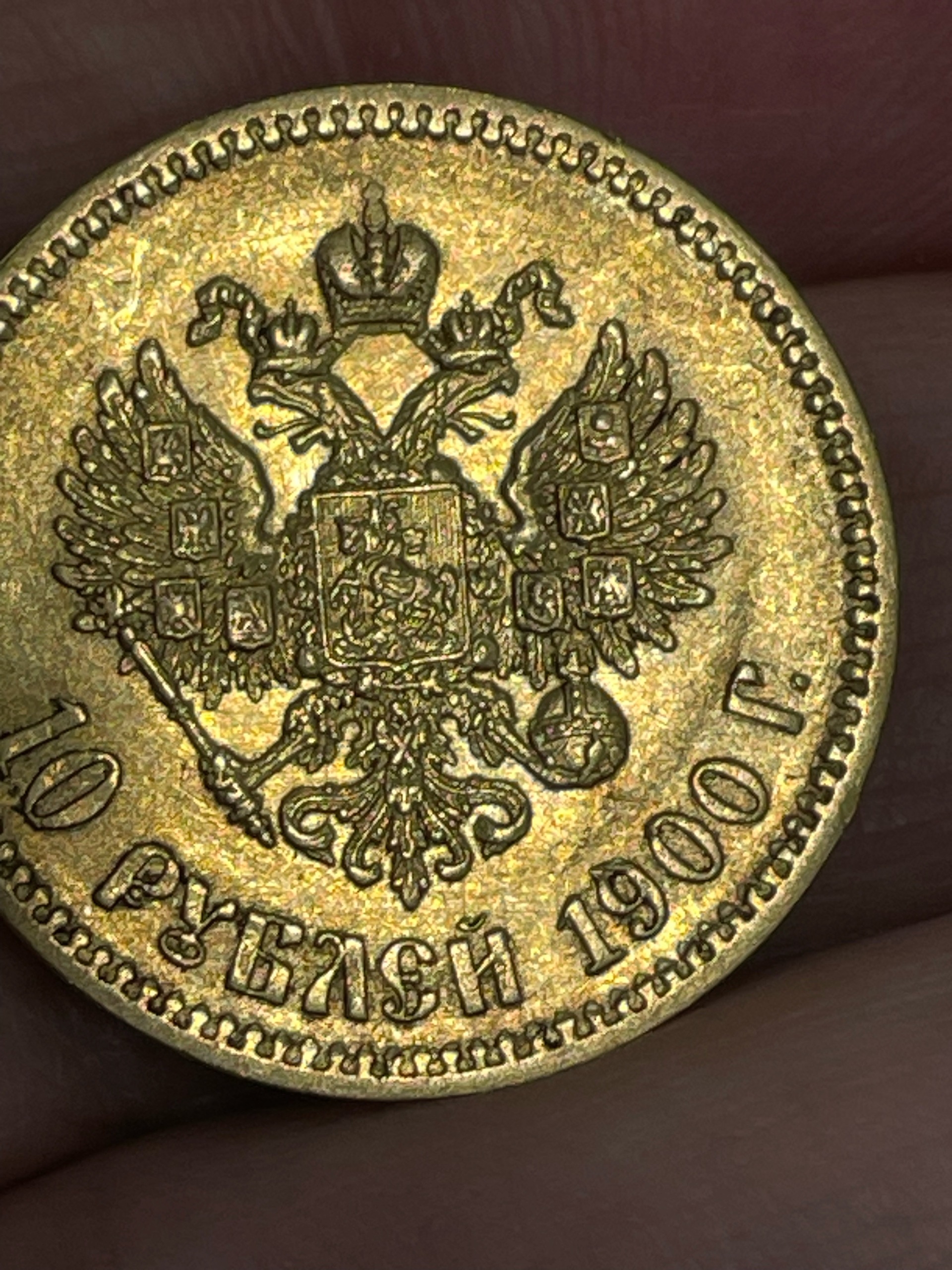 Золотая монета номиналом 10 рублей 1900 года, отчеканенная в период правления императора Николая II. Монета соответствует оригиналу: использован портрет типа 1900 года (№7 по каталогу), поздний вариант герба Российской Империи и гуртовая надпись, выполненная в стиле старославянской вязи. Комментарии экспертов подтверждают её подлинность и оценивают в 48-60 тысяч рублей.