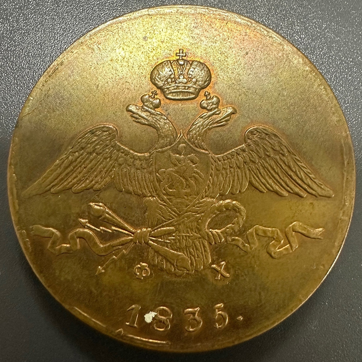 Монета номиналом 10 копеек 1835 года, отчеканенная на Екатеринбургском монетном дворе (ЕМ) в период правления Николая I. Представленный экземпляр является современной подделкой, что подтверждается единодушным мнением экспертов в комментариях. Неправильный цвет металла и общий вид указывают на низкокачественную фальшивку.
