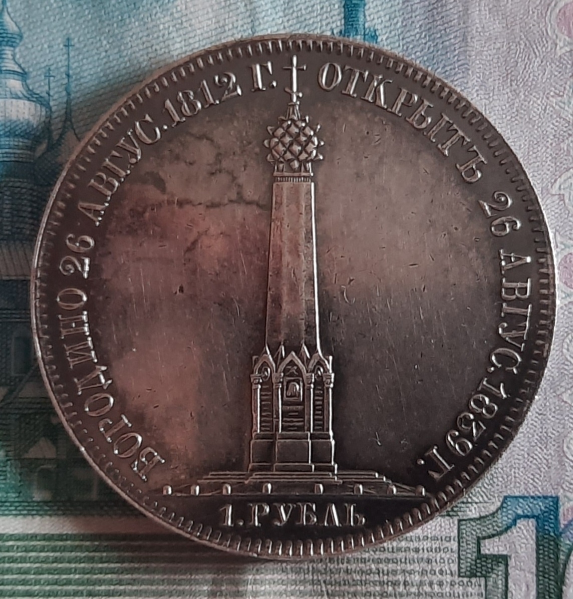 Монета посвящена открытию Бородинского памятника в 1839 году. Это памятный серебряный рубль времён правления Николая I. Представленный экземпляр является подделкой, о чём свидетельствуют грубые ошибки в деталях изображения, отмеченные экспертами.