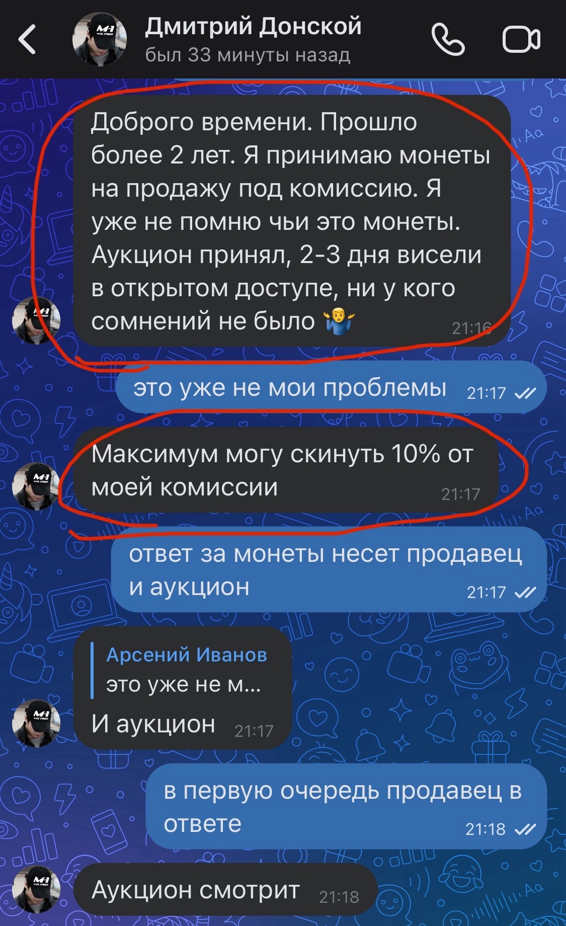 В посте сообщества обсуждается продавец, известный под ником Дмитрий Донской, который через аукционную площадку продал покупателю три монеты, оказавшиеся поддельными. Продавец отказывается от ответственности, затягивает возврат денег и продолжает выставлять лоты. Комментаторы единогласно признают монеты фальшивыми, используя сленг «фуфло», «копии», «китай», и указывают на систематическую деятельность продавца.
