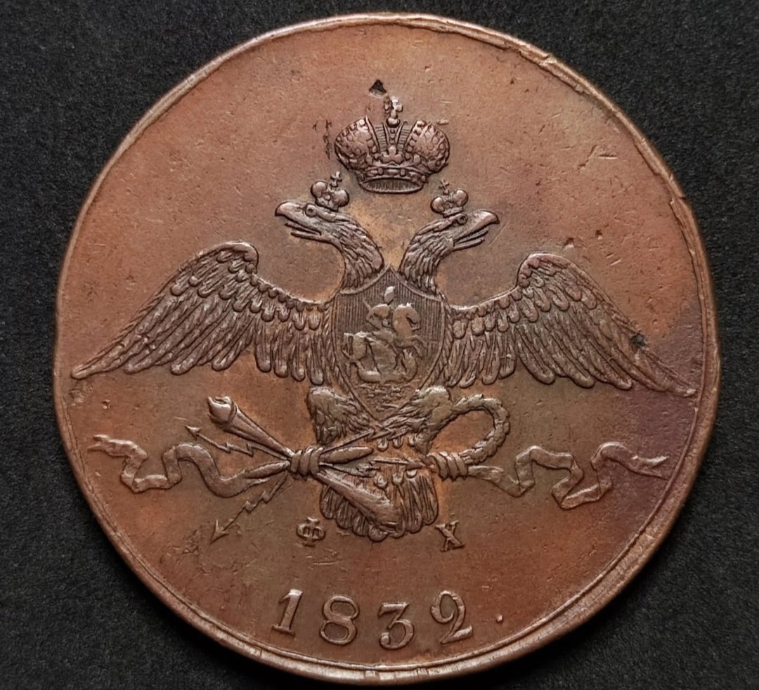 Серебряная монета номиналом 10 копеек, отчеканенная в 1832 году в правление императора Николая I. Монета имеет обозначение монетного двора «ЕМ» (Екатеринбургская монета) и инициалы минцмейстера «ФХ» (Фёдор Хвощинский). Судя по консенсусу экспертов в комментариях, представленный экземпляр является подлинным и не имеет признаков подделки.