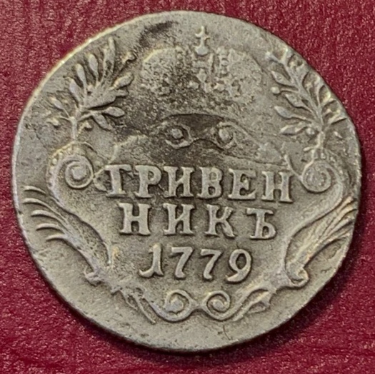 Монета представляет собой гривенник (10 копеек) периода правления Емператрицы Екатерины II, отчеканенный на Санкт-Петербургском монетном дворе в 1779 году. Судя по описанию в посте, это не оригинальная монета, а копия, изготовленная для коллекционеров или в сувенирных целях. Подлинные экземпляры этого года имеют высокую коллекционную ценность и специфические характеристики, которые у копий часто отсутствуют.