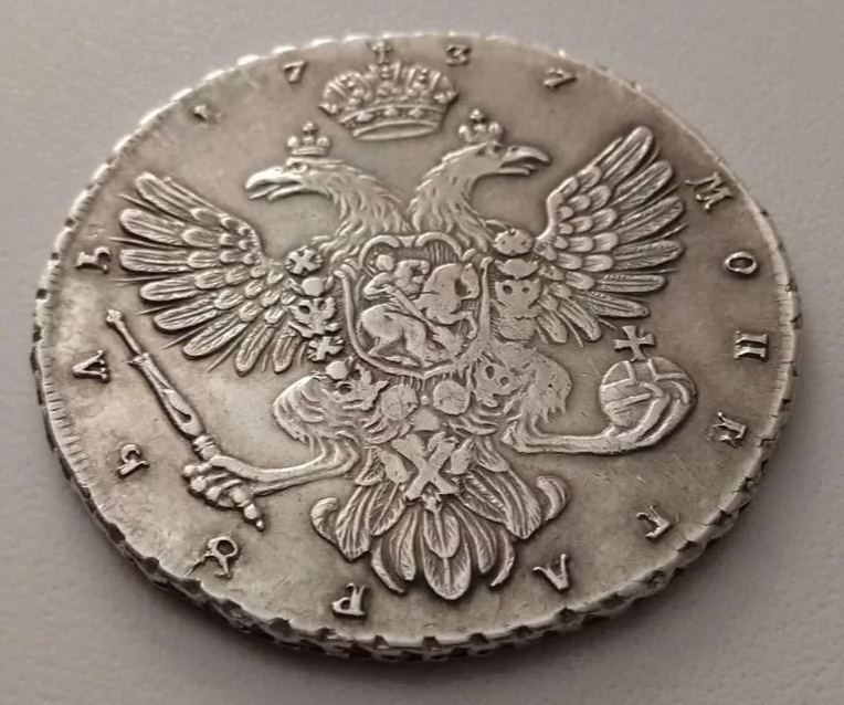 Монета представляет собой копию серебряного рубля 1737 года, отчеканенного в период правления императрицы Анны Иоанновны. Оригинальные монеты этого типа имеют высокую коллекционную ценность и часто подделываются. В данном случае автор поста прямо указывает, что это подделка, что подтверждается контекстом обсуждения в комментариях.