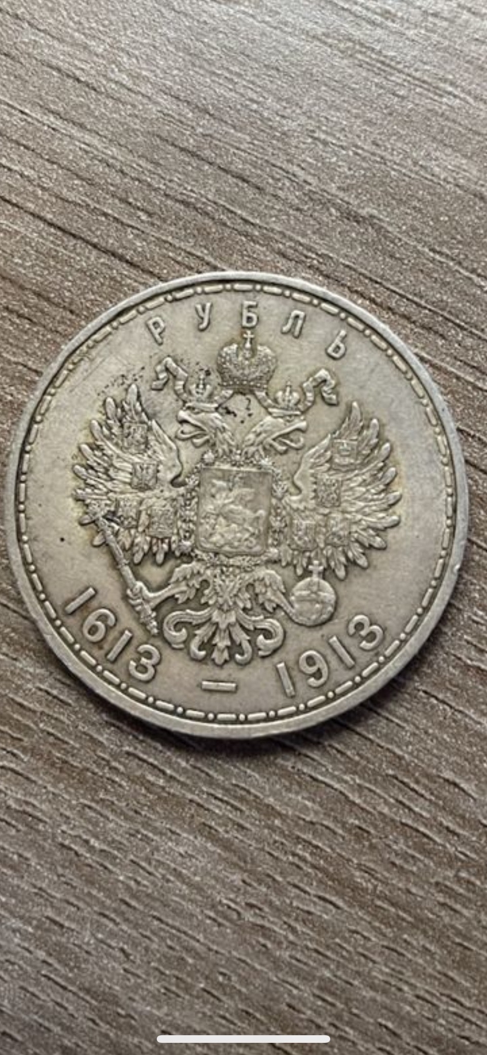 Юбилейный рубль 1913 года, выпущенный в честь 300-летия династии Романовых. Монета отчеканена из серебра при Николае II. Представленный экземпляр является качественной современной подделкой, о чём свидетельствуют несоответствия в деталях гурта, шрифтах и патине.