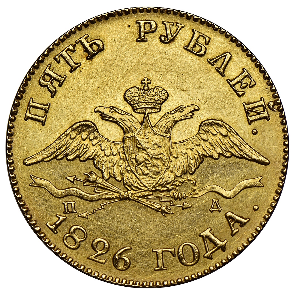 Золотая монета 5 рублей 1826 года, отчеканенная при Николае I на Санкт-Петербургском монетном дворе. Это качественная современная подделка, отлитая и доработанная вручную. Фальшивка массово проходила через западные аукционы и даже попадала в сертифицированные слабы NGC.