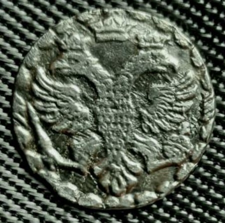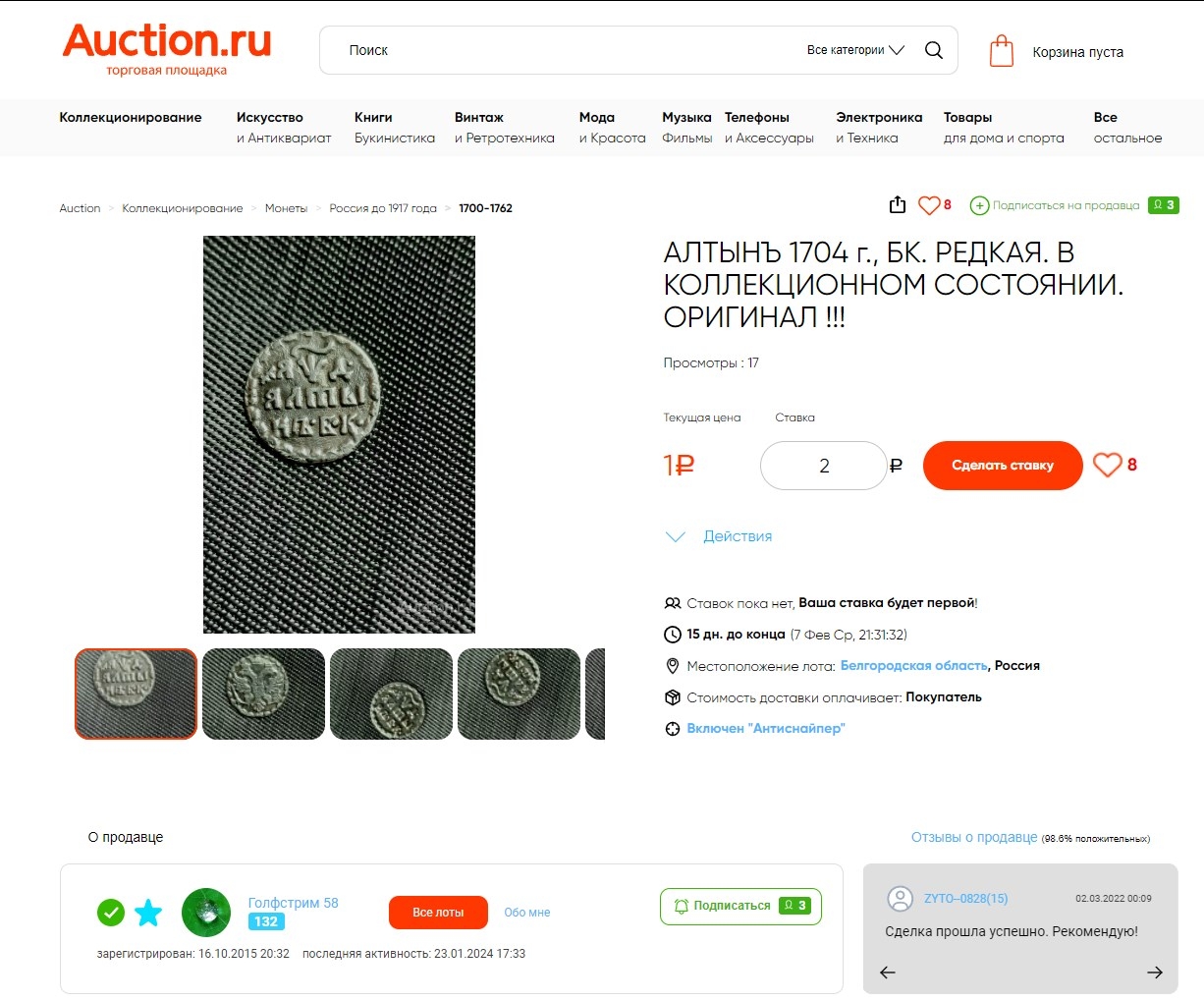 Монета представляет собой медный алтын 1704 года, отчеканенный в период правления Петра I. В оригинале это редкая и ценная монета раннего петровского чекана. Однако, как указано в самом посте, данный экземпляр является подделкой, что характерно для рынка из-за высокой стоимости подлинника.