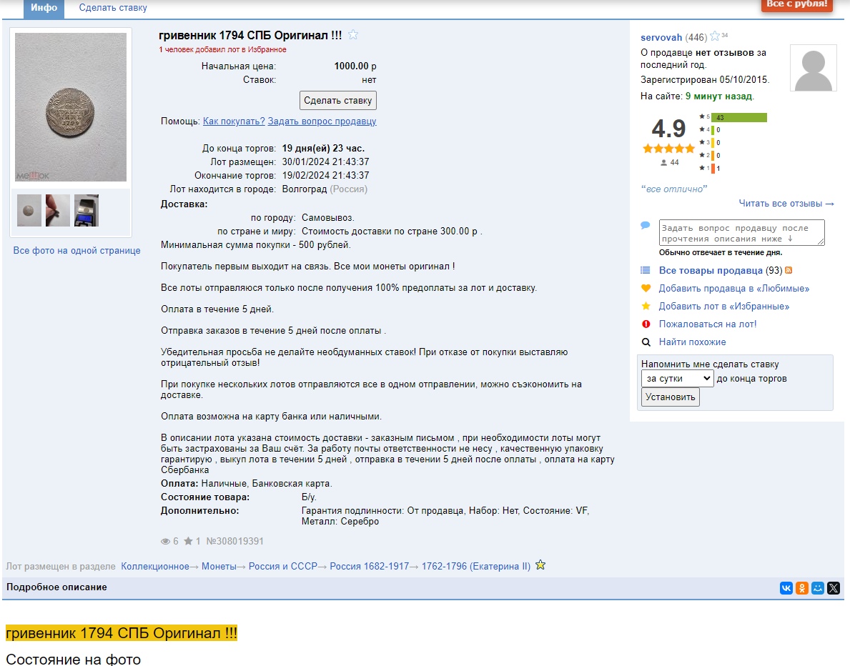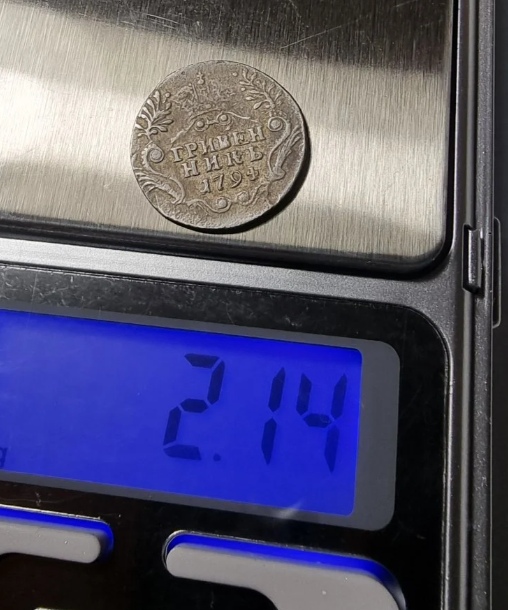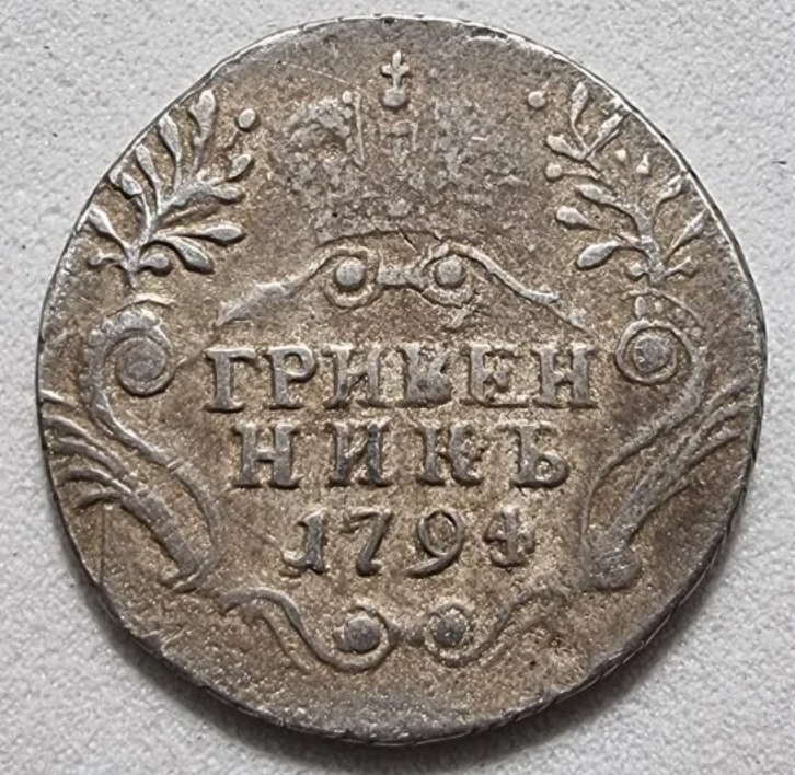Монета представляет собой гривенник (10 копеек) времён правления Екатерины II, отчеканенный на Санкт-Петербургском монетном дворе в 1794 году. Однако, согласно консенсусу в сообществе нумизматов, данная монета является подделкой. Основные признаки фейка, как правило, видны на поле монеты, что характерно для низкокачественных копий.