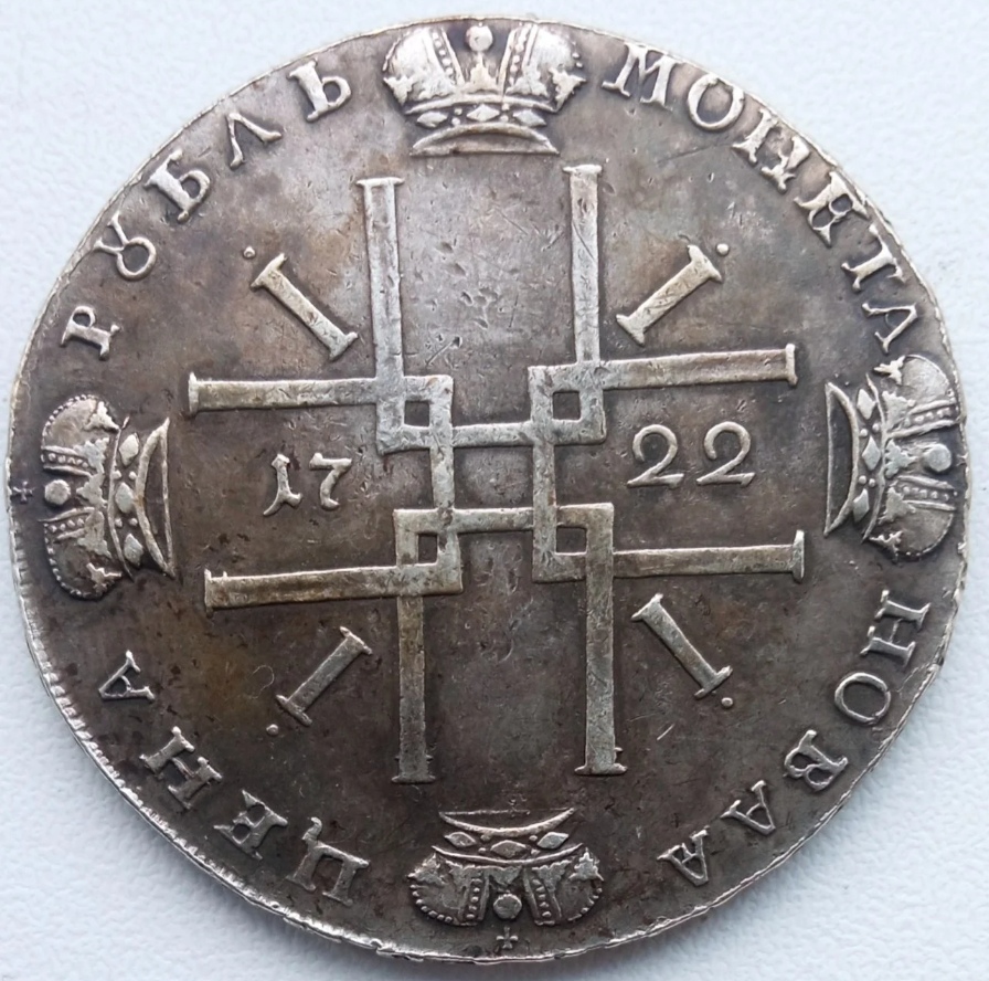 Монета представляет собой копию серебряного рубля 1722 года, отчеканенного в период правления Петра I. Оригинальные рубли этого года имеют высокую коллекционную ценность и встречаются редко. В посте прямо указано, что это копия, что делает её современной подделкой, не имеющей нумизматической ценности.
