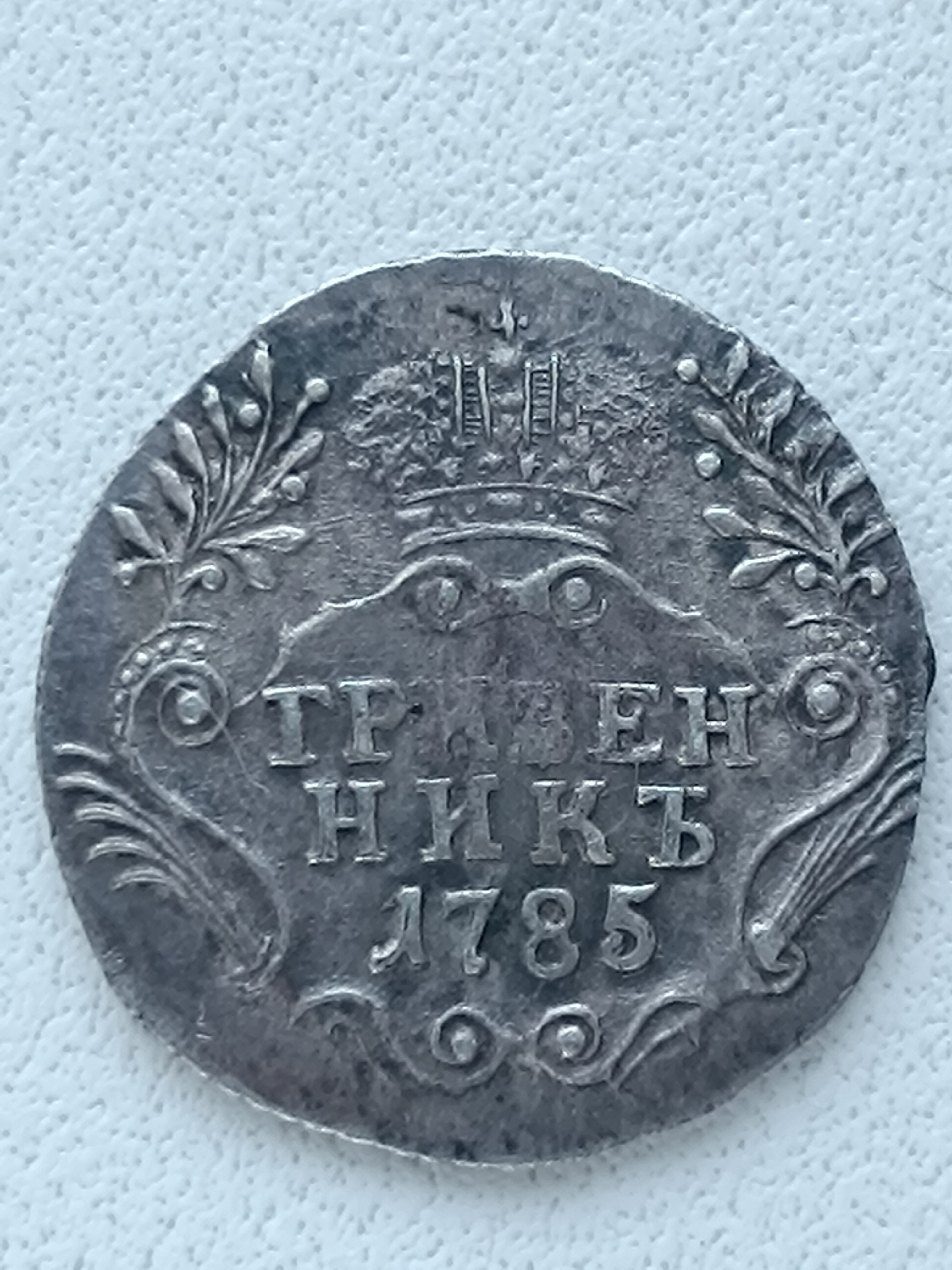 Серебряный гривенник (10 копеек) 1785 года, отчеканенный в период правления Емператрицы Екатерины II. Монета данного типа имеет стандартные параметры для своего номинала и времени выпуска. На основании единственного комментария без аргументов и отсутствия детальных фотографий невозможно сделать однозначный вывод о подлинности.